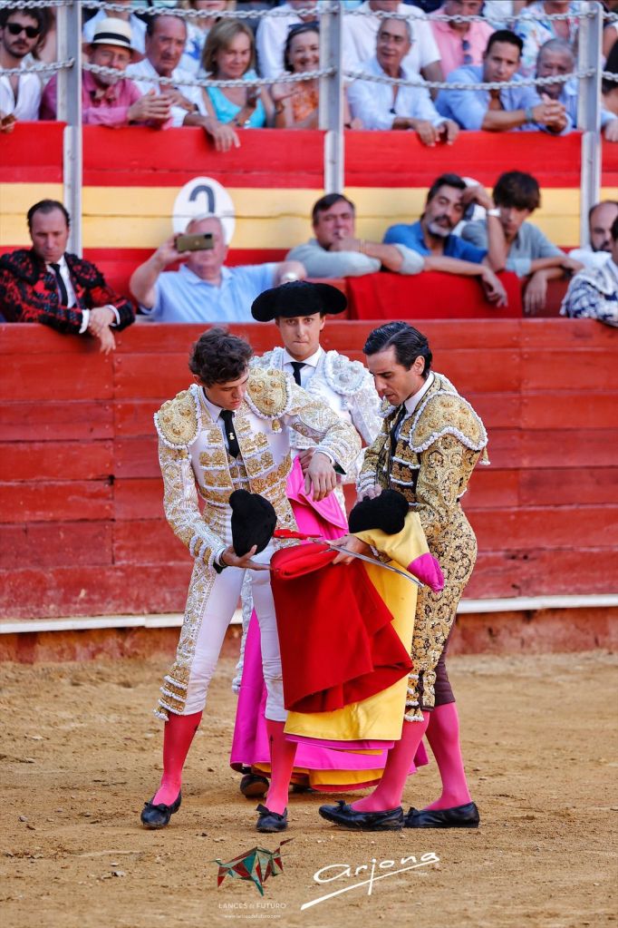 El momento más esperado llegaba a las 19:22 horas, cuando un Jorge Martínez vestido de blanco y oro tomaba la alternativa de manos de Juan Ortega, con el nuevo «mandón»del toreo, Roca Rey de testigo. «Carretera» de «El Parralejo», ganadería que sutituía a la anunciada de «Álvaro Núñez», completaba la foto para la historia.