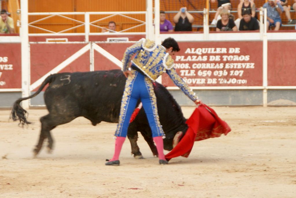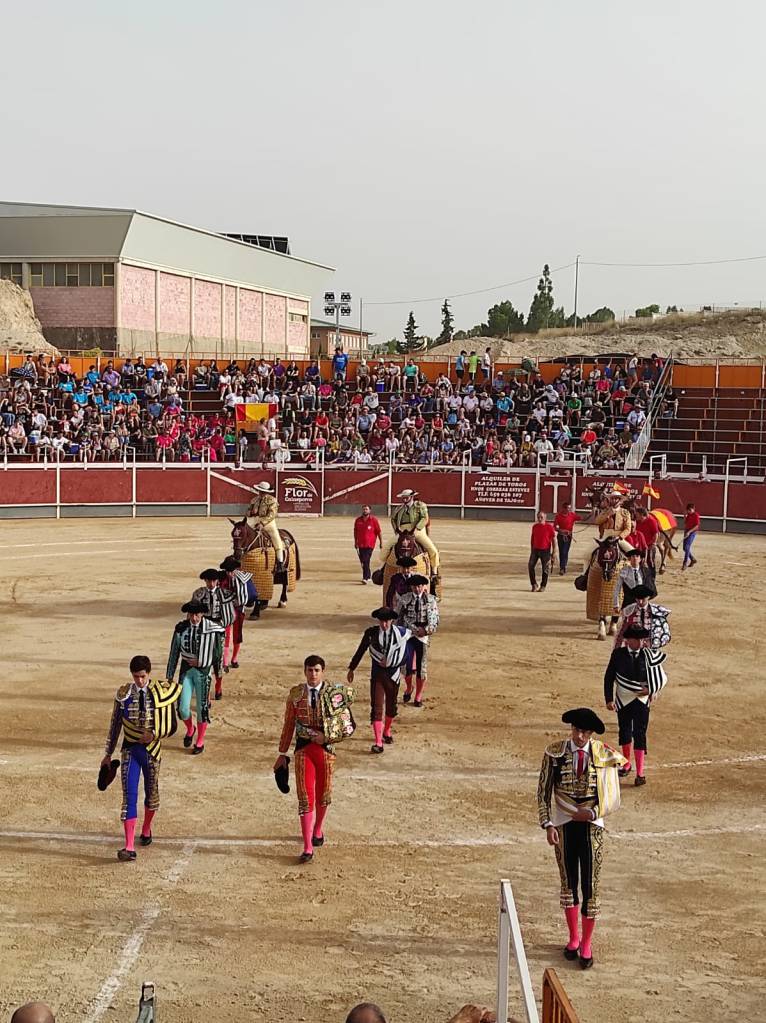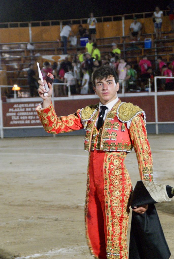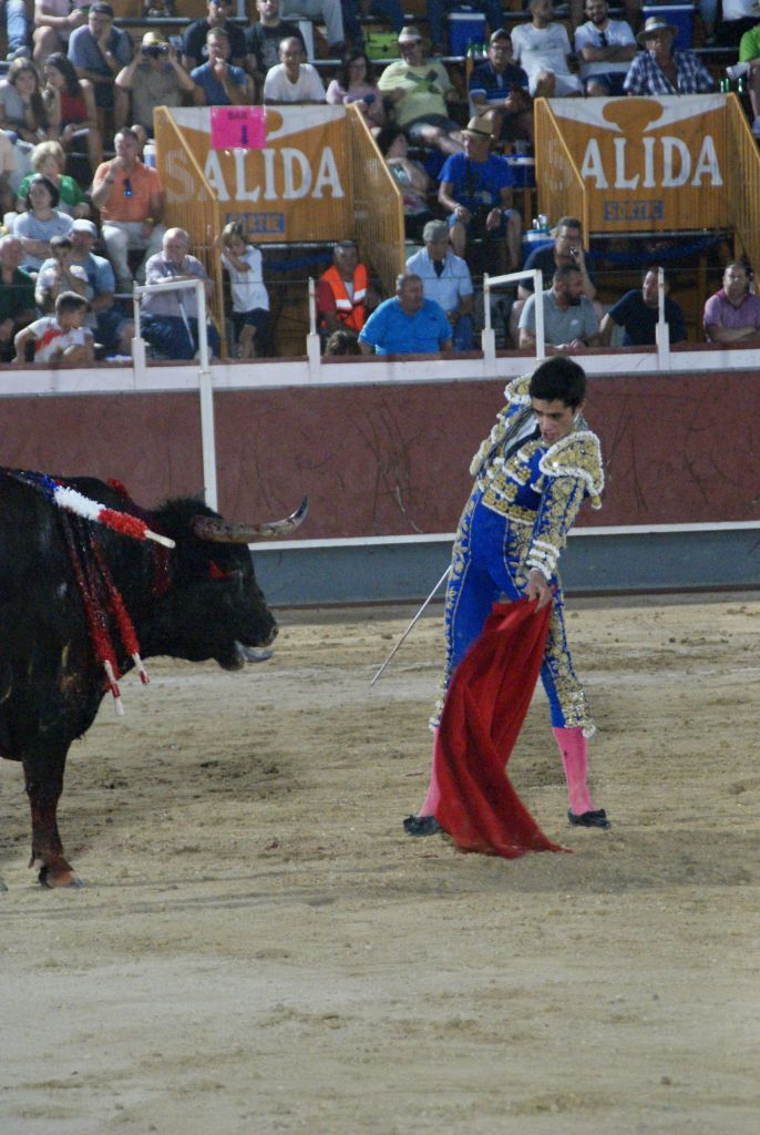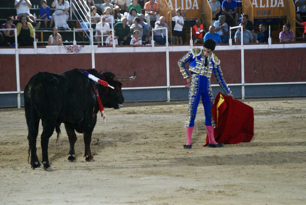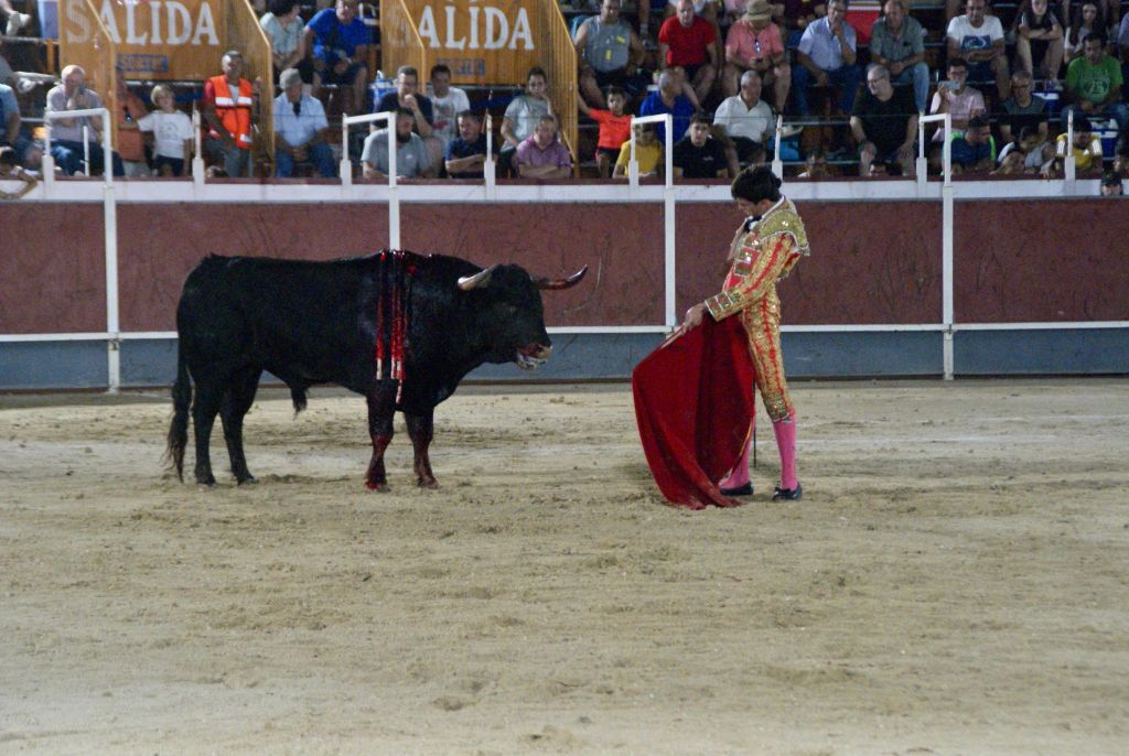 Abrió la novillada y la feria el novillo “Cigarro” de “Los Bayones” que acudió alegre al capote que le ofreció Jorge Molina, que le instrumentó un buen saludo capotero a la verónica. El animal cumplió en varas, recibiendo un puyazo largo. Tras el tercio de banderillas de trámite, el novillero brindó el trasteo al torero albaceteño Rubén Pinar, presente en la plaza.
