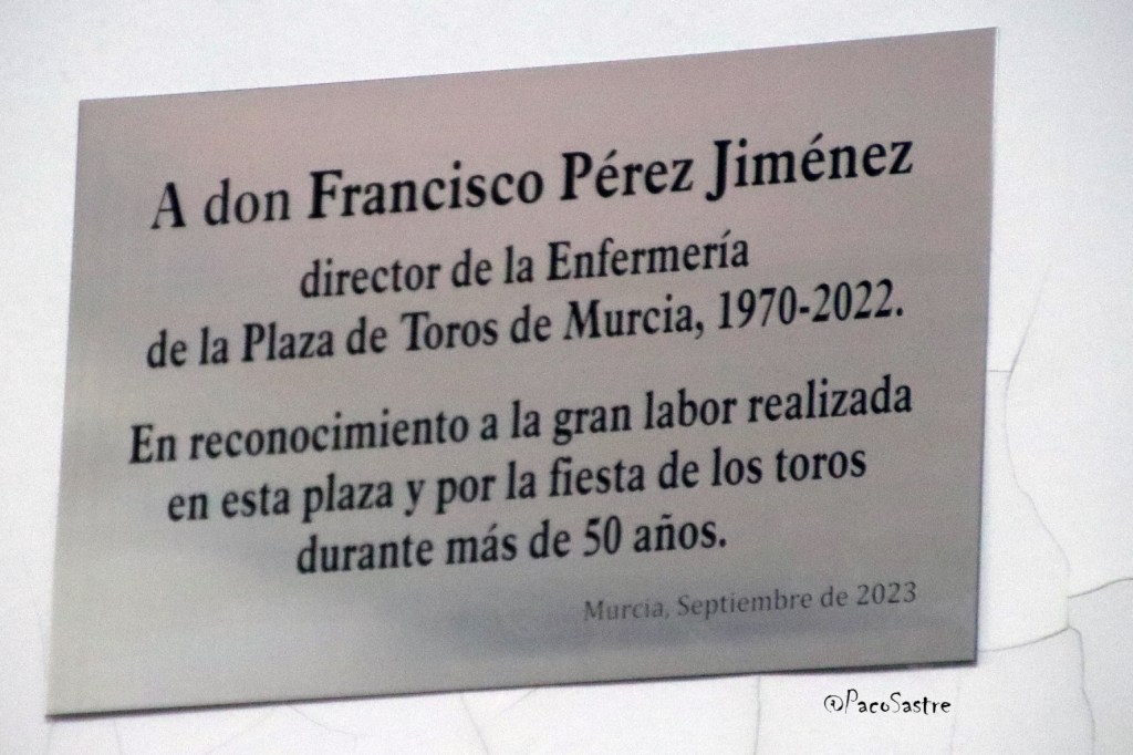 Este martes, 12 de septiembre, antes del inicio de la 3ª corrida de toros de la Feria de Murcia, el equipo médico de la plaza de toros de La Condomina, capitaneado por el Doctor Ricardo Robles, ha homenajeado la figura de Francisco Pérez en la enfermería de la plaza de toros de la capital de la Región de Murcia.