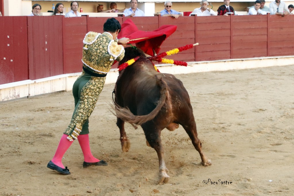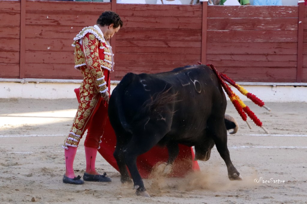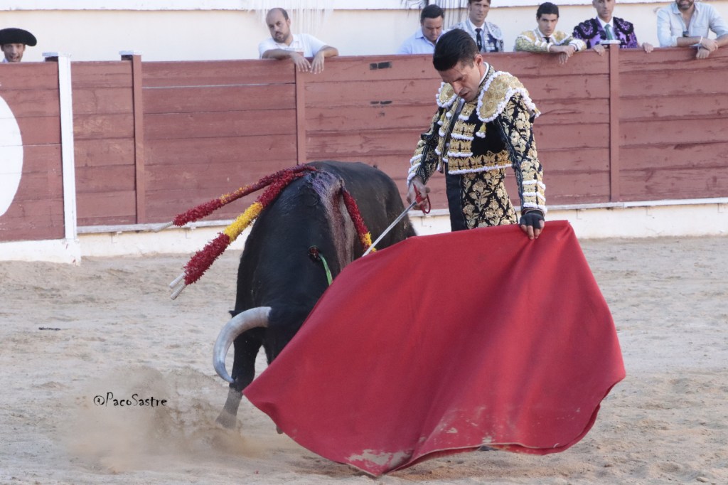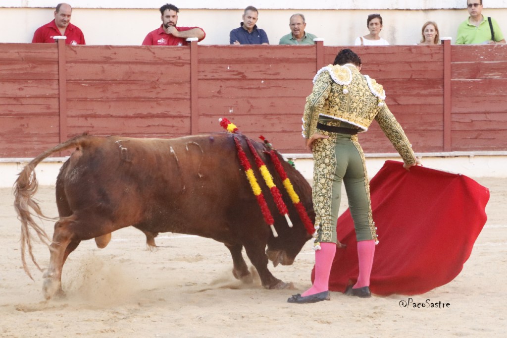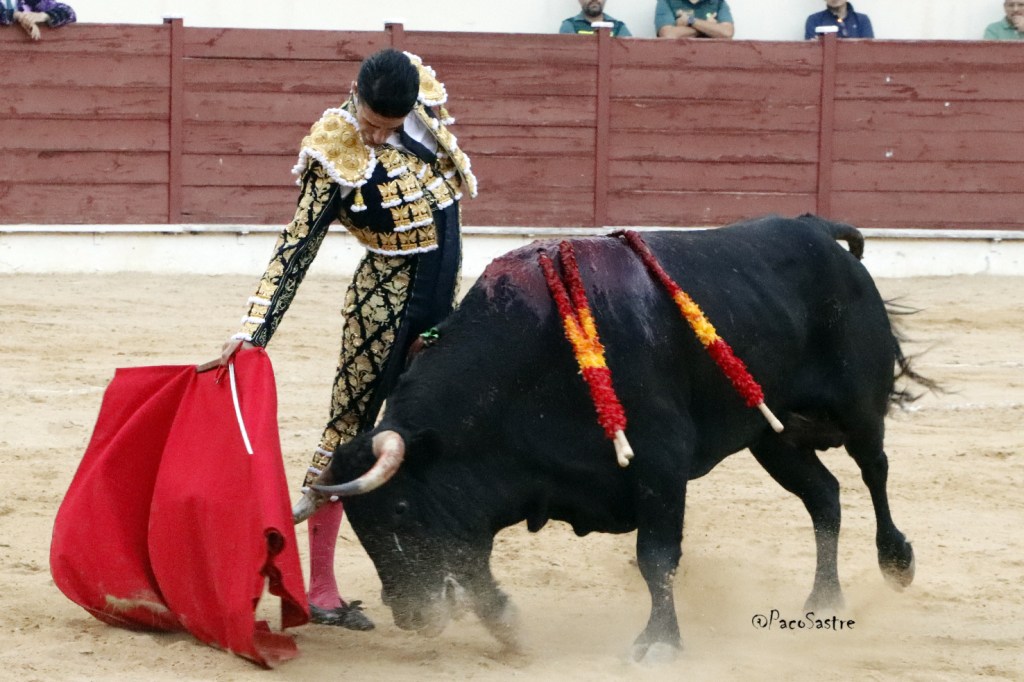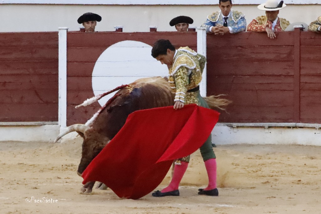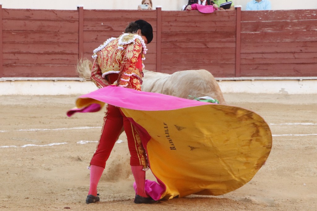 Dos orejas cortó Rafaelillo del primero, un toro noble pero con las fuerzas justas. Lo recibió con una larga cambiada, un ramillete de verónicas y la media. Brindó al tendido, comenzó obra de rodillas y alargó con oficio los muletazos del animal. Lo despenó de una estocada y paseó dos orejas.