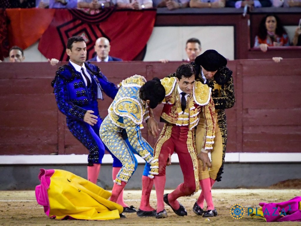 «Lastimado», del hierro titular de Victoriano del Río, abrió plaza mostrando poco celo en el capote de Sebastián Castella, que recetó un saludo por verónicas. Cumplió en el caballo el animal, aunque fue poco castigado en varas por orden del torero francés. Entró Paco Ureña en el quite dejando tres verónicas muy buenas de mano baja y una revolera. En la salida, el toro le tropezó con las patas traseras, cayendo el de Lorca al suelo y librándose milagrosamente de una voltereta segura por sus reflejos y la rapidez en levantarse. Castella replicó el quite con unas tafalleras ajustadas de mucho mando y poder.
