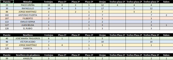 “Parrita” aparece con un festejo, la novillada en la que actuó en la pasada feria de Blanca. Esta en el puesto número 129 del escalafón.