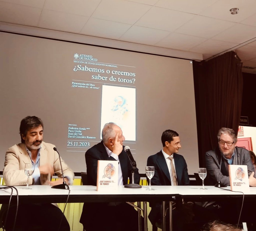 Pedro López Arriba, director de ateneo de Madrid, abrió la charla en la que la afición a los toros fue la gran protagonista. Precisamente, en el libro de Federico se trata de poner a prueba la cultura taurina de los aficionados partiendo de una serie de preguntas divididas por temáticas: del toro al torero, pasando por la prensa, los aficionados o los reglamentos. El autor propone tres respuestas posibles a las incógnitas ofrecidas y según la elegida por el lector se pueda constatar su sabiduría taurina.