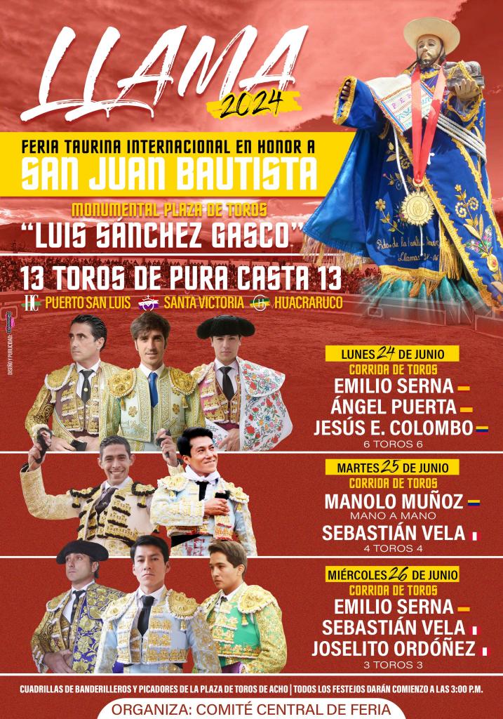 Tal y como les avanzamos el pasado 5 de abril, el torero murciano Emilio Serna, que este 2024 cumple 20 años de alternativa, hará doblete en la feria taurina de peruana de San Juan Bautista que se celebrará en el Distrito de Llama (Chota) durante los días 24, 25 y 26 de junio.