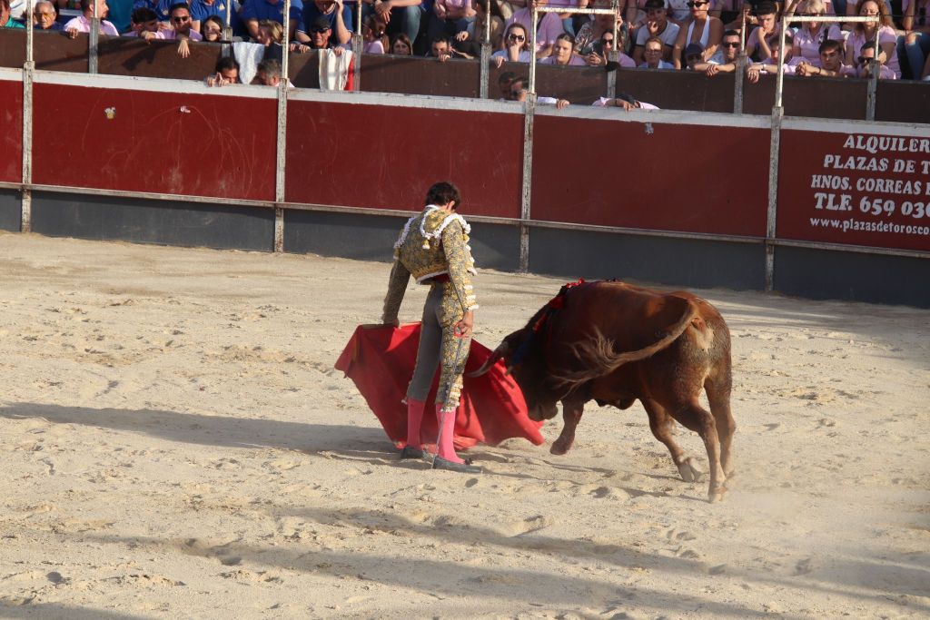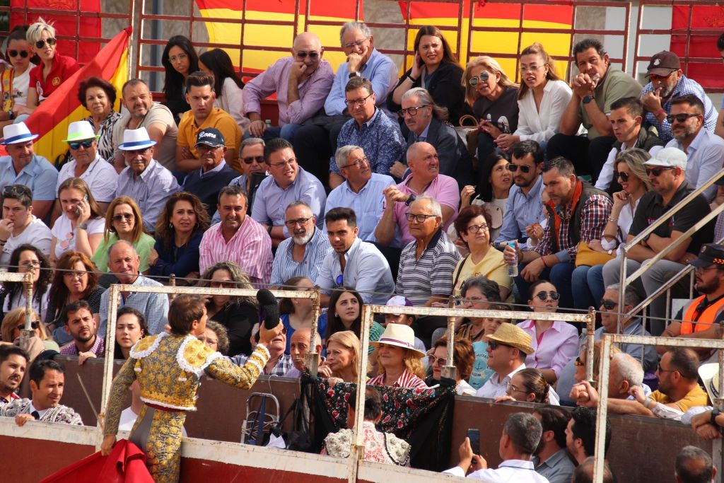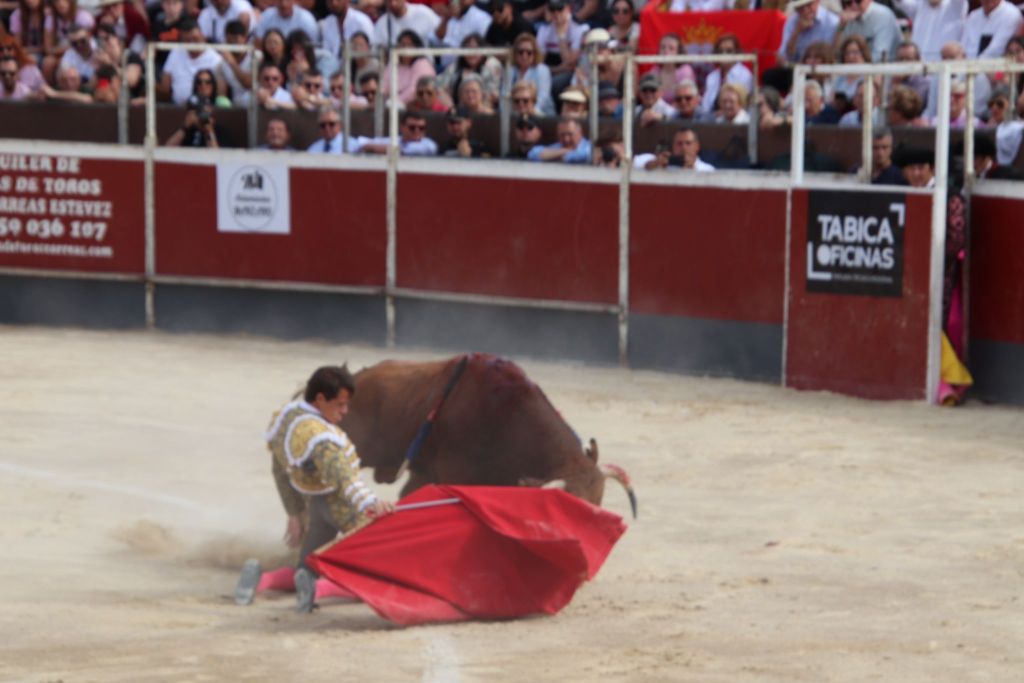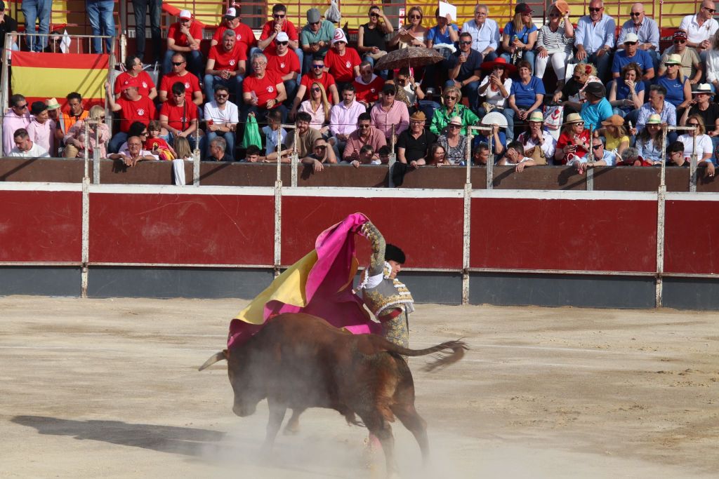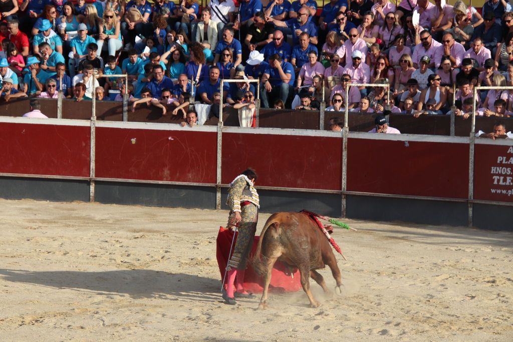 Tras la merienda que suele realizarse en las plazas mediterráneas, se reanudó el festejo con la suelta de “Planeador” al que Trigueros recibió con verónicas templadas. El animal clavó los pitones en el suelo, dándose una tremenda voltereta. El novillero, enrazado, se echó el capote en la espalda, improvisando para llegar al público y el novillo lo revolcó sin consecuencias. Tras un tercio de varas de trámite, el novillero cuajó un quite a la verónica de excelente factura, templado y embarcando al novillo. Sin duda, lo mejor de su actuación con el capote. Pareó bien Alberto López “Niño del Barrio”. José María Trigueros, que intentó siempre darle variedad a la tarde, arrancó la faena a este tercer novillo del festejo sentado en una silla de enea. Estuvo muy torero, dejando muletazos largos y templados. Sorprendió el novillero y el público se lo agradeció con una sonora ovación. Una vez finalizada la tanda de la silla, el novillero siguió navegando en el clamor del momento con dos tandas de derechazos entregadísimas, al compás de los clarines. Un momento muy emotivo. El novillo respondió a la exigencia del novillero, que plasmó dos series de naturales, muy encajado, muy de verdad, toreando como si estuviera en una plaza de más categoría. El de Javalí Nuevo se reveló, haciendo ver que es merecedor de más oportunidades y que tiene las cualidades para ocupar un puesto importante en la tauromaquia de la Región de Murcia. Recetó un pinchazo antes de dejar una estocada entera de efecto fulminante. El público sacó los pañuelos con furor y hasta las manos del valiente novillero fueron a parar dos orejas. Al novillo se le premió con la vuelta al ruedo en el arrastre.