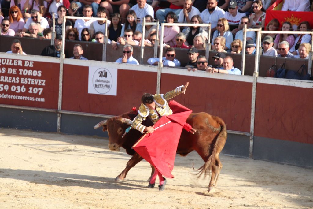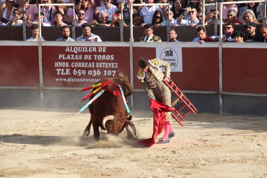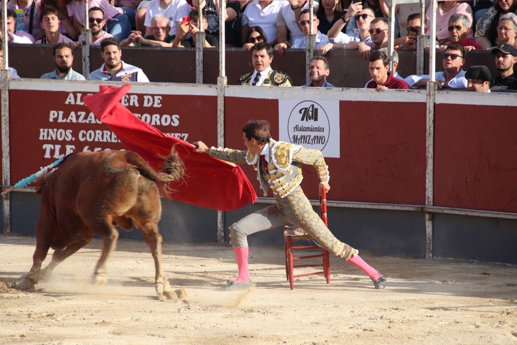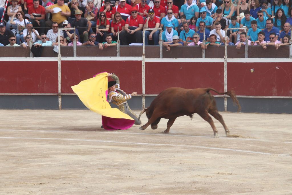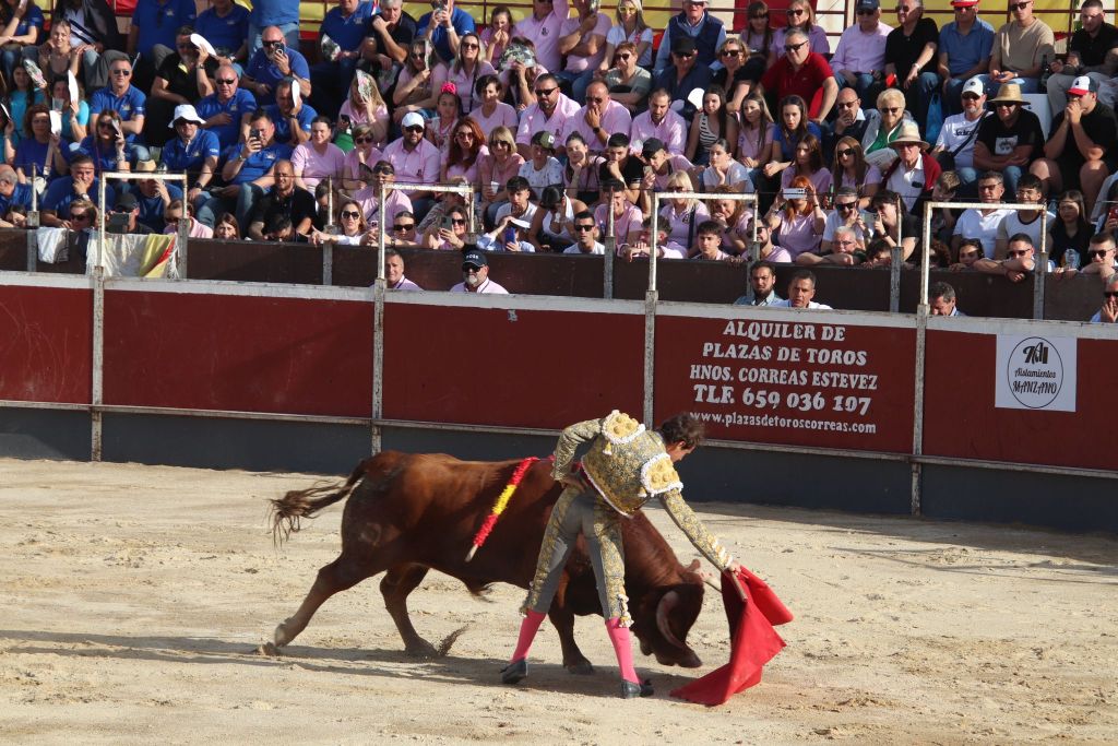 Tras la merienda que suele realizarse en las plazas mediterráneas, se reanudó el festejo con la suelta de “Planeador” al que Trigueros recibió con verónicas templadas. El animal clavó los pitones en el suelo, dándose una tremenda voltereta. El novillero, enrazado, se echó el capote en la espalda, improvisando para llegar al público y el novillo lo revolcó sin consecuencias. Tras un tercio de varas de trámite, el novillero cuajó un quite a la verónica de excelente factura, templado y embarcando al novillo. Sin duda, lo mejor de su actuación con el capote. Pareó bien Alberto López “Niño del Barrio”. José María Trigueros, que intentó siempre darle variedad a la tarde, arrancó la faena a este tercer novillo del festejo sentado en una silla de enea. Estuvo muy torero, dejando muletazos largos y templados. Sorprendió el novillero y el público se lo agradeció con una sonora ovación. Una vez finalizada la tanda de la silla, el novillero siguió navegando en el clamor del momento con dos tandas de derechazos entregadísimas, al compás de los clarines. Un momento muy emotivo. El novillo respondió a la exigencia del novillero, que plasmó dos series de naturales, muy encajado, muy de verdad, toreando como si estuviera en una plaza de más categoría. El de Javalí Nuevo se reveló, haciendo ver que es merecedor de más oportunidades y que tiene las cualidades para ocupar un puesto importante en la tauromaquia de la Región de Murcia. Recetó un pinchazo antes de dejar una estocada entera de efecto fulminante. El público sacó los pañuelos con furor y hasta las manos del valiente novillero fueron a parar dos orejas. Al novillo se le premió con la vuelta al ruedo en el arrastre.