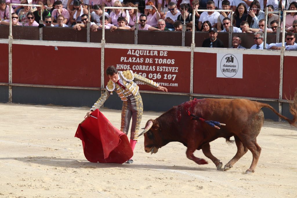 Trigueros recibió al segundo de la tarde a la verónica. El animal mostró desde salida falta de fuerza. Se le cuidó en el caballo y se cambió con dos pares de banderillas. Lo dio todo el novillero en la muleta, siempre con suavidad y sin «tirones», para evitar que se fuera al suelo. Compuso bien la faena el murciano, que dejó series cortas a media altura, rematadas con pases de pecho de pitón a rabo. Buscó la conexión con el público con un arrimón sincero al final de faena, mostrándose firme y capaz. Cerró por manoletinas ajustadas. Mató de estocada entera tendida, teniendo que utilizar varias veces el verduguillo.