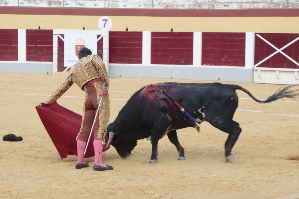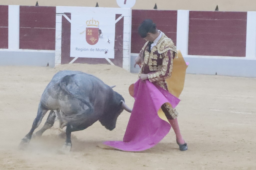 José María Trigueros, espoleado por el triunfo de “Parrita” en el segundo, salió a comerse a su primer oponente, otro “novillito” de Cayetano Muñoz con gran calidad. Le recetó un sensacional recibo a la verónica. Quiso estar muy variado con el capote Trigueros, y en un quite por gaoneras, el animal le arroyó de fea manera, propinándole un golpe tremendo que enmudeció al público. Se levantó como un resorte y se fue de nuevo a la boca de riego, a terminar con el capote a la espalda lo que el novillo no le había dejado hacer. Tremenda actitud que el público premió con una sonora ovación. En banderillas, brilló Carlos Pacheco, saludando tras parear con entrega. Trigueros brindó la faena al director general de Administración Local, Francisco Abril, presente en el callejón de la plaza. Se tiró de hinojos el murciano en la primera tanda, dejando con brillantes y poderosos muletazos. Cuajó con la mano derecha al buen animal de Cayetano Muñoz, llevando al novillo largo en tandas de mucha entrega y profundidad, demostrando que está suficientemente preparado para afrontar compromisos de más envergadura.