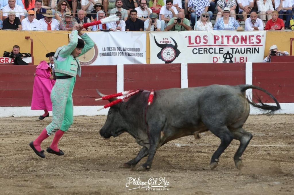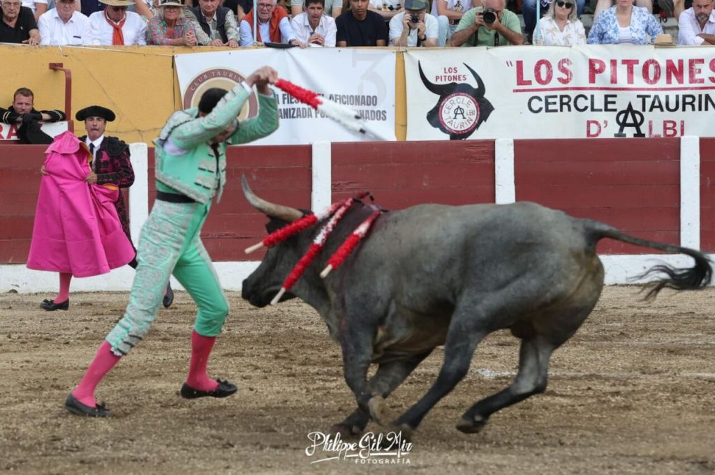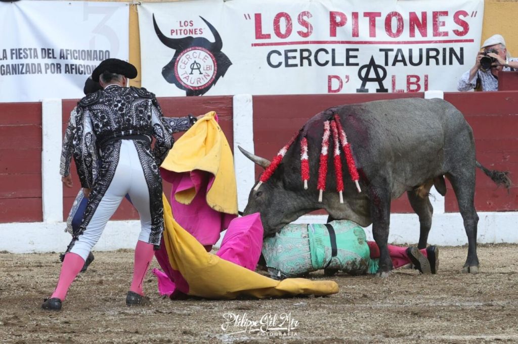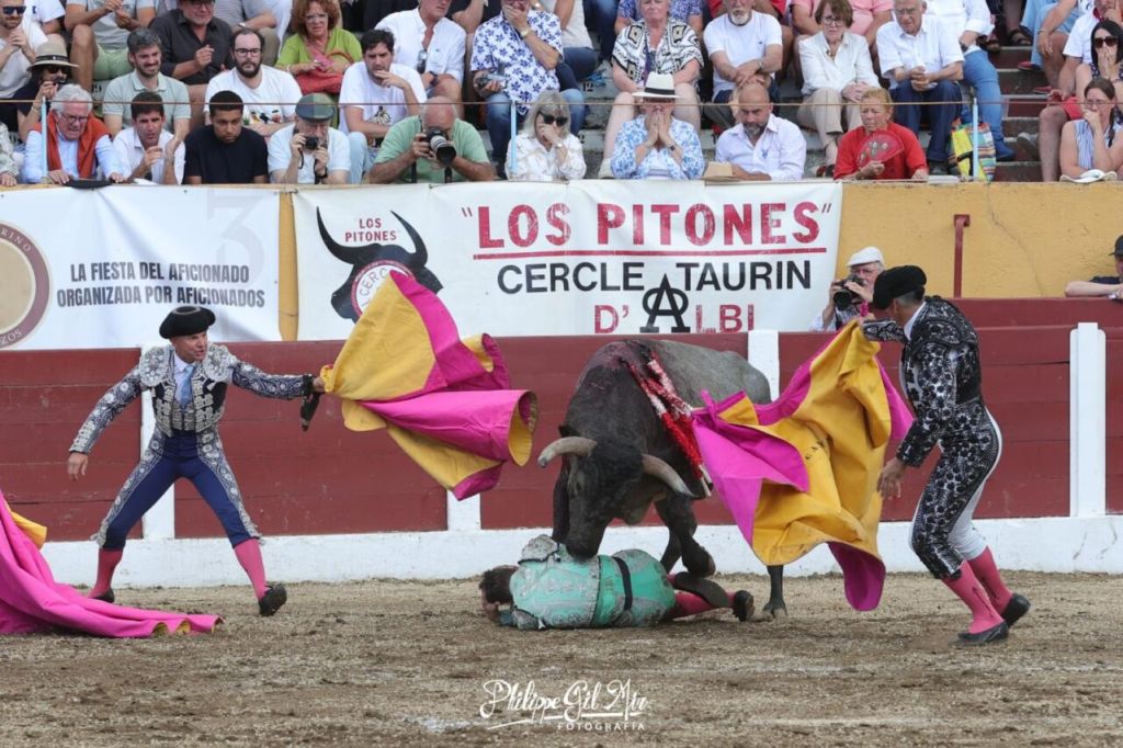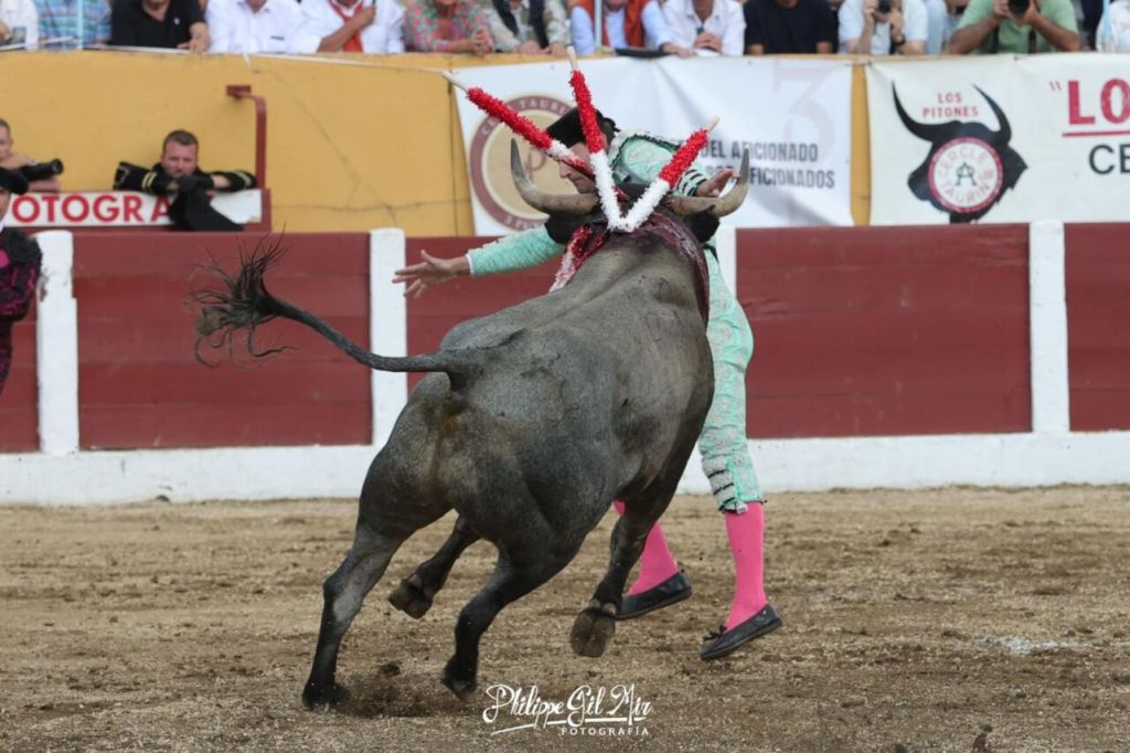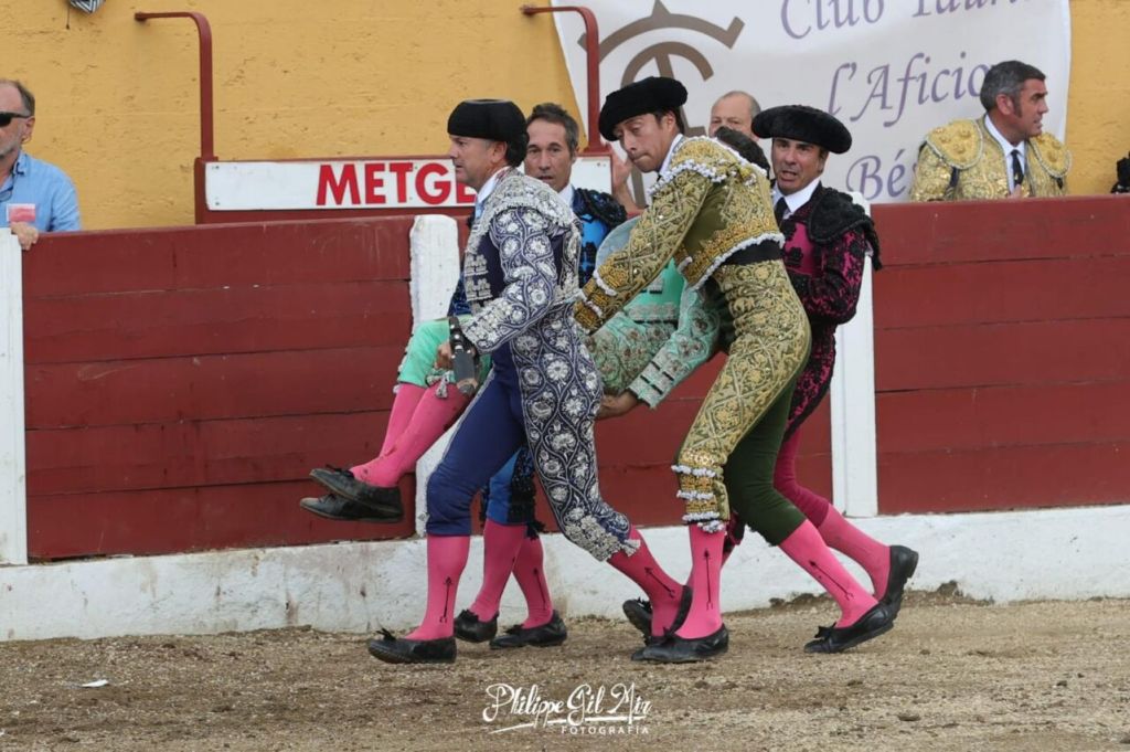 Con el favor del público, que aplaudió fuertemente su intervención arriesgada y con verdad, se fue el murciano a poner colofón a un gran tercio de banderillas. Sin embargo, esta vez, perdió pie tras clavar los palos, y en el suelo, el animal hizo presa, propinándole una visible cornada en la parte trasera del muslo izquierdo, muy cerca del glúteo. Rápidamente sus compañeros lo auxiliaron, trasladándolo a la enfermería del coso galo. En el trayecto se percibió que la herida era importante por el volumen de sangrado que emitía esta.