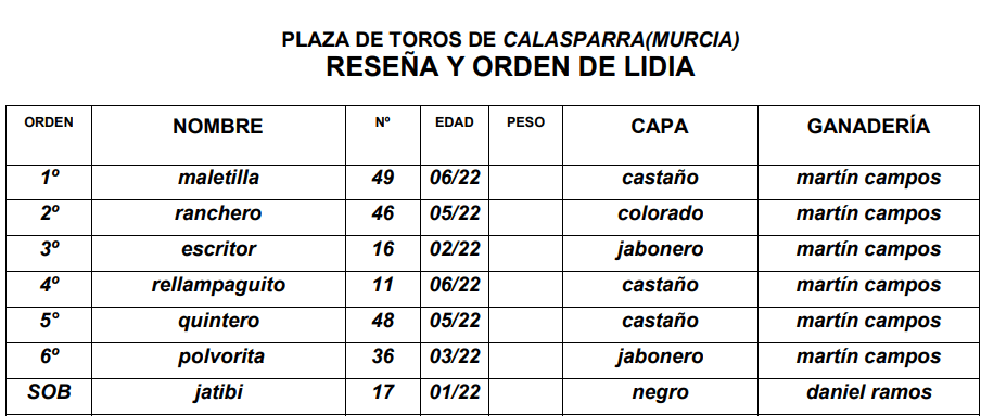 Como manda la tradición, a las 12 en punto y con presencia de la autoridad competente y representantes de cada matador, ha tenido lugar en Calasparra el sorteo de los novillos que protagonizarán el primer festejo del certamen «Espiga de Plata» en la tarde este sábado.
