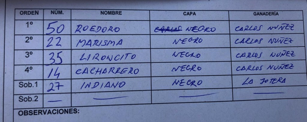 El orden de lidia de los novillos de La Jotera queda de la siente manera: