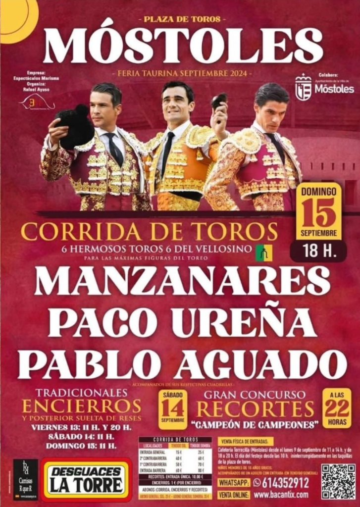 Este 15 de septiembre, Espectáculos Marisma y el Ayto. de Mostoles vuelven a apostar por la tauromaquia y al igual que en la primavera, las figuras harán el paseíllo en esta localidad. En esta ocasión serán José María Manzanares, Paco Ureña y Pablo Aguado los protagonistas de un gran cartel en el que se lidiarán reses de «El Vellosino».