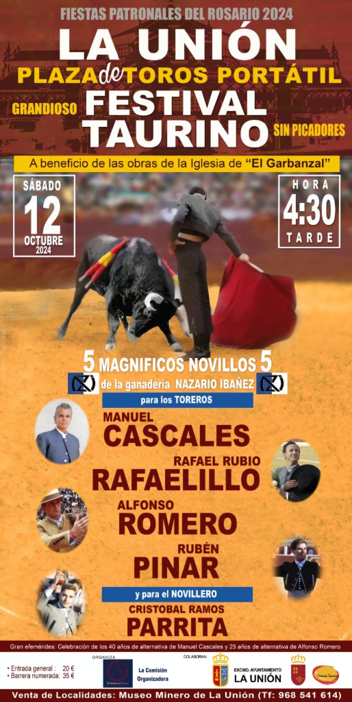 Según ha podido confirmar «El Muletazo», la localidad murciana de La Unión volverá a disfrutar de un festejo taurino, con motivo de las fiestas patronales del Rosario, el sábado 12 de octubre, a las 4 y media de la tarde, en un plaza portátil. Los beneficios del festival sin picadores irán destinados a las obras de la iglesia de «El Garbanzal».