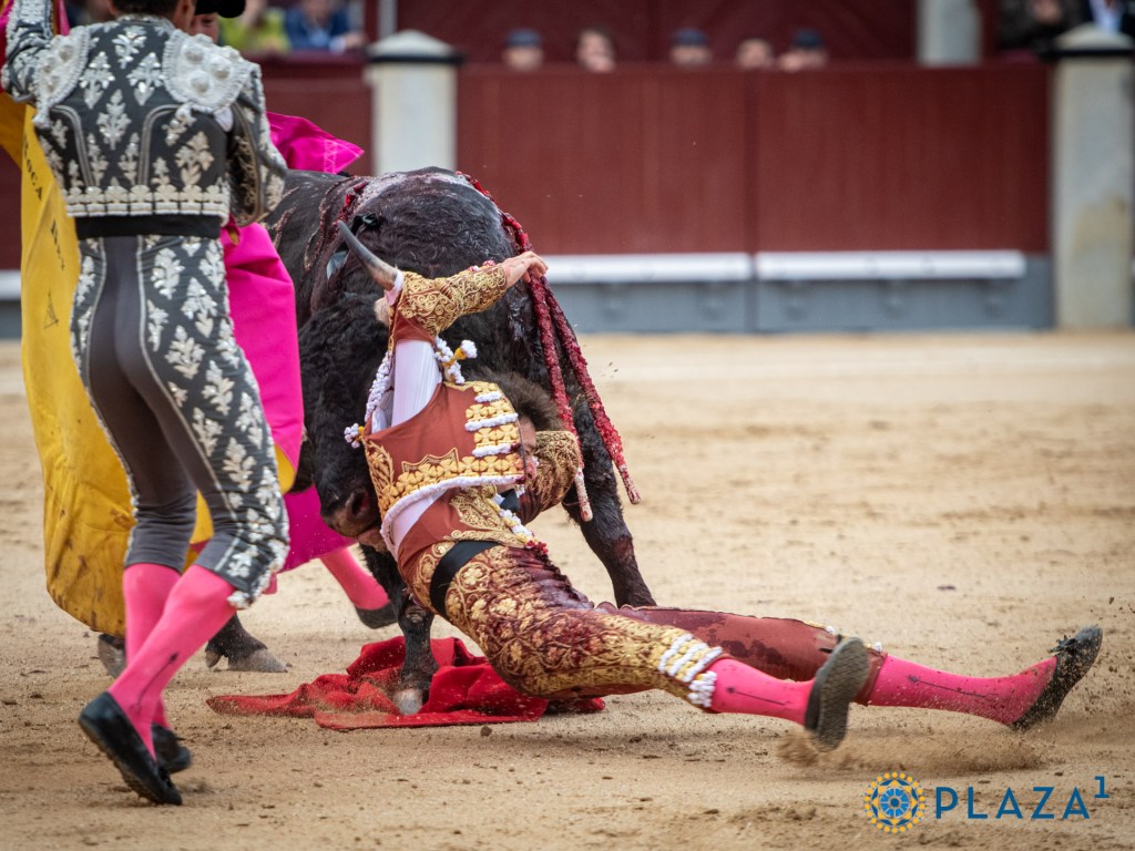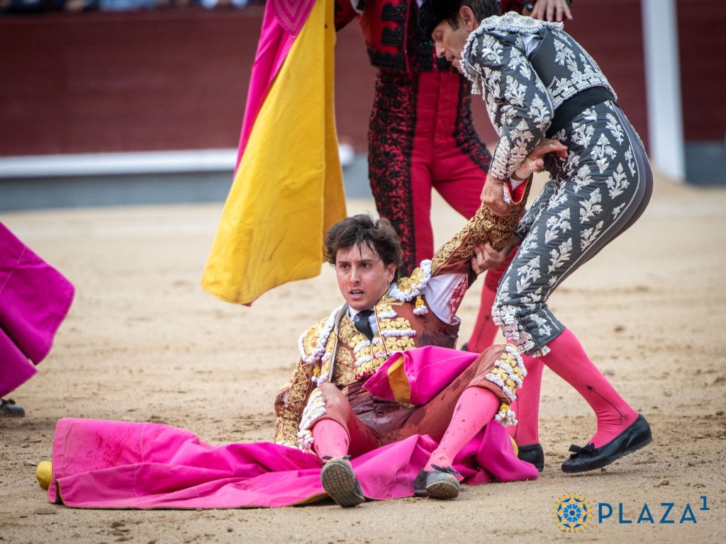 Serio pero más bajo era el Soplón segundo, animal de 557 kilos, con sus puntas arriba, frío de salida en la capa de Roca Rey. Al relance entró a la primera vara de Sergio Molina, que aguantó bien el envite de un animal que empujó. Y también metió riñones en la segunda, con celo. Por ajustadas saltilleras quitó Víctor Hernández. Al tendido fue el brindis del peruano, que dejó un impactante inicio de faena de rodillas en las rayas del tercio, dejando dos primeras series por la mano derecha a un toro con codicia pero exigente. Y redujo su viaje Andrés, que planteó el toreo de nuevo por la diestra y aguantó parones y en uno de ellos el toro le dio una tremenda paliza. Cogió como un trapo al torero, al que un sector del tendido 7 alto recriminaba segundos antes su colocación. Fue una cogida muy violenta de la que milagrosamente se repuso en segundos el torero. Y le sopló una serie más por la mano derecha que puso a la plaza de nuevo de su parte. Aunque hizo despacio la suerte, pinchó hondo a la primera y enterró el acero a la segunda. Cortó una oreja tras petición mayoritaria.