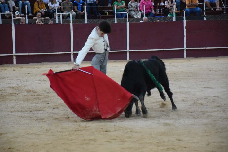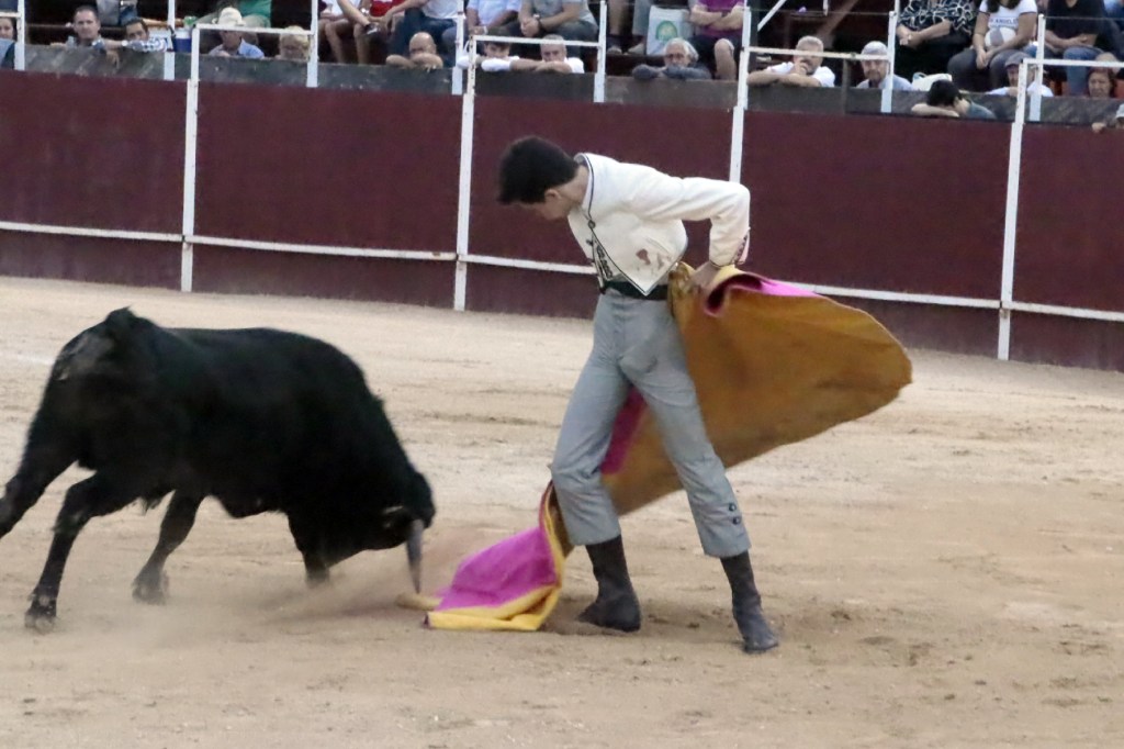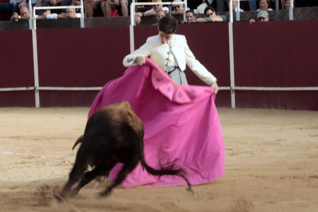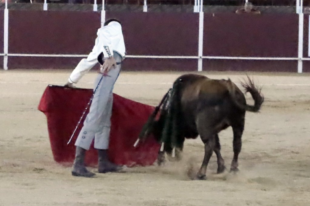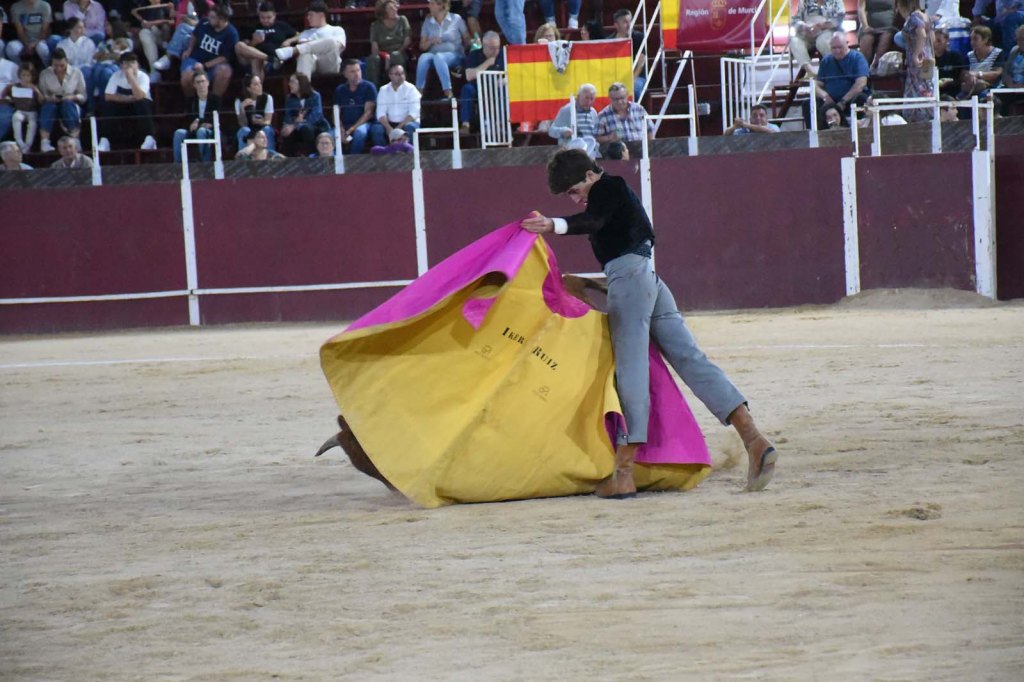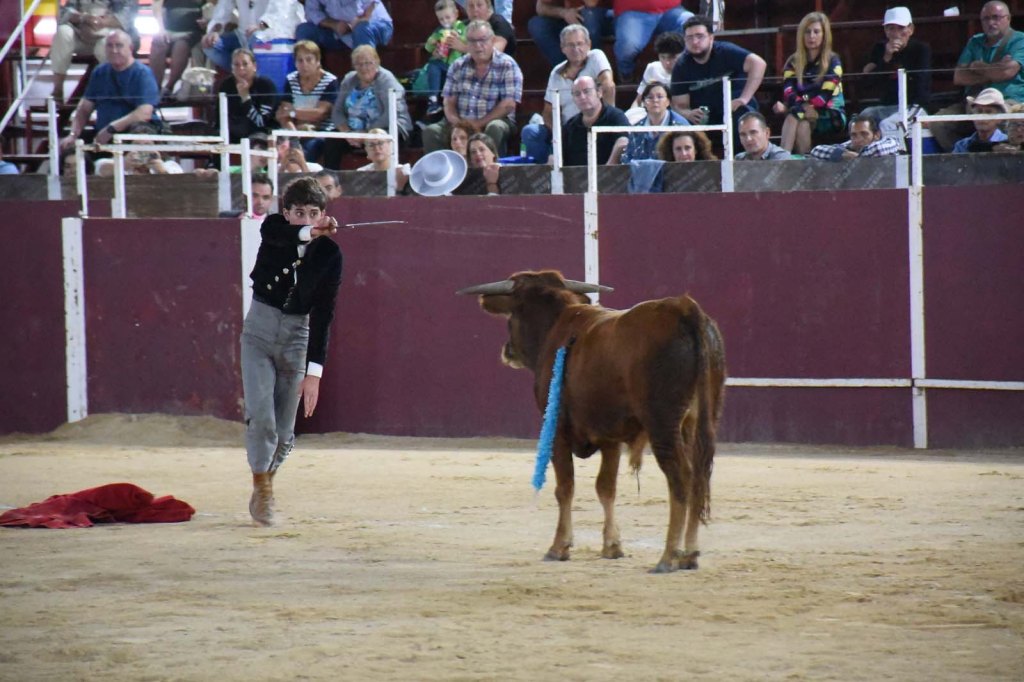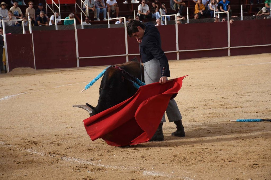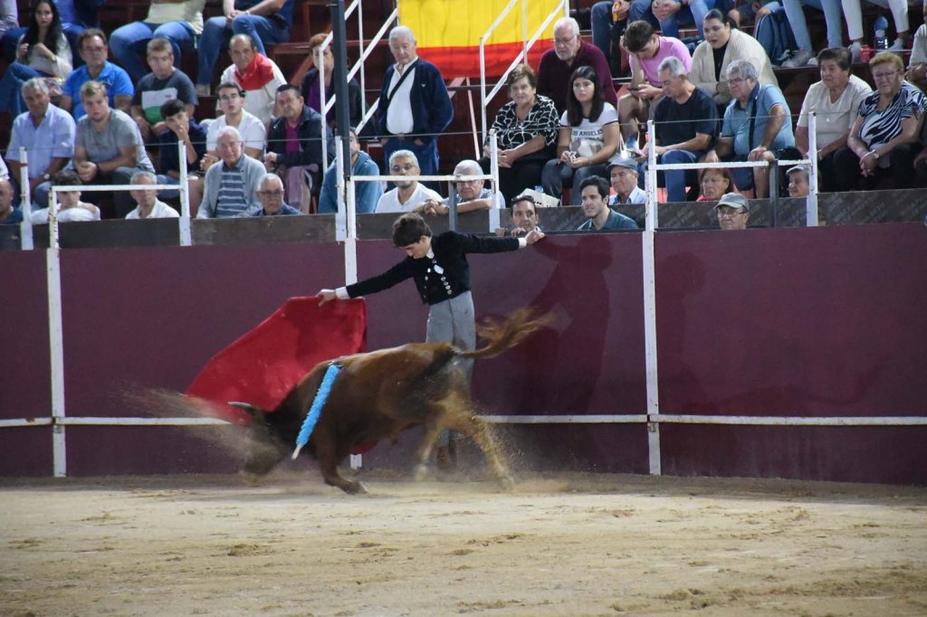 Toni Marín recibió arrebatado por delantales a su becerro, resultando los mismos algo enganchados, pasando después a dejar chicuelinas con mucho mando y transmisión al tendido. El murciano, alumno de la escuela «Amigos del Toreo», inició la faena de hinojos, dejando un derechazo afarolado que gustó mucho al respetable. Estuvo solvente y capaz por ambos pitones, ante un animal con más transmisión y poder que el primero de la tarde. Faena vistosa y muy entregada en la que consiguió, pese a los nervios, muletazos con mando. Estuvo valiente Marín, ajustándose de verdad en una serie de manoletinas. Dejó una estocada trasera y desprendida. El puntillero le levantó al toro, pero eso no fue un obstáculo para que el público le pidiese las dos orejas que la presidencia concedió sin discusión.