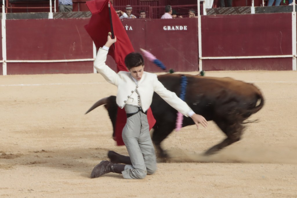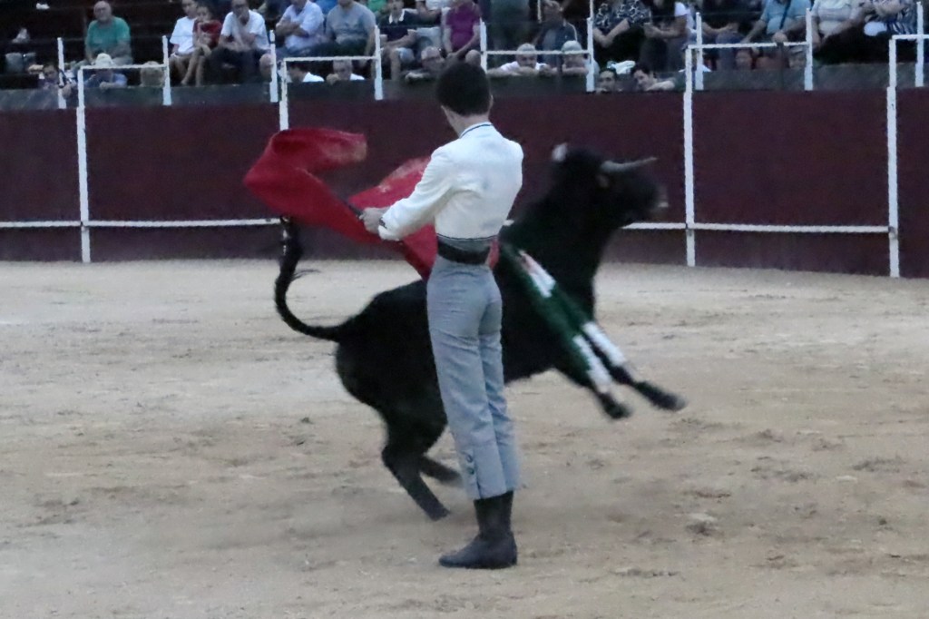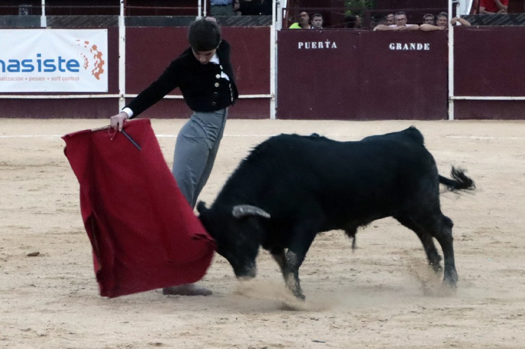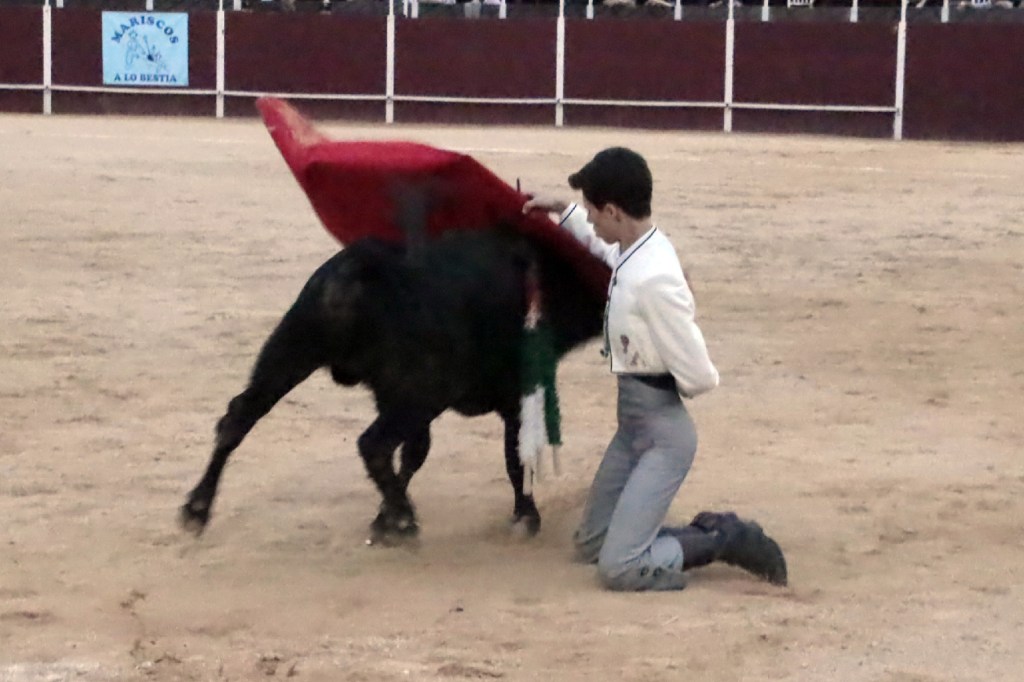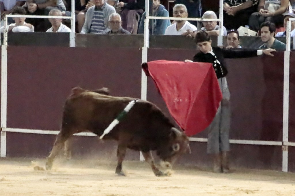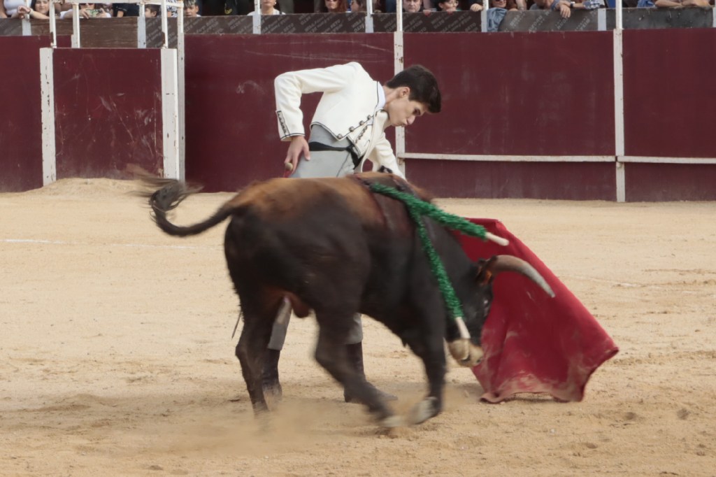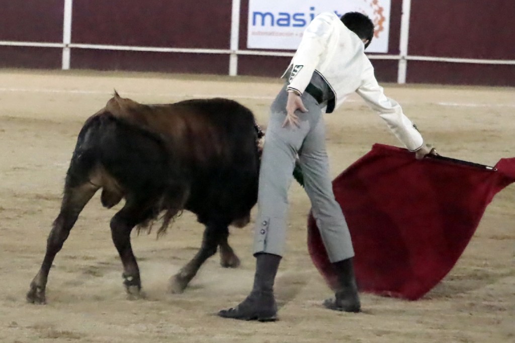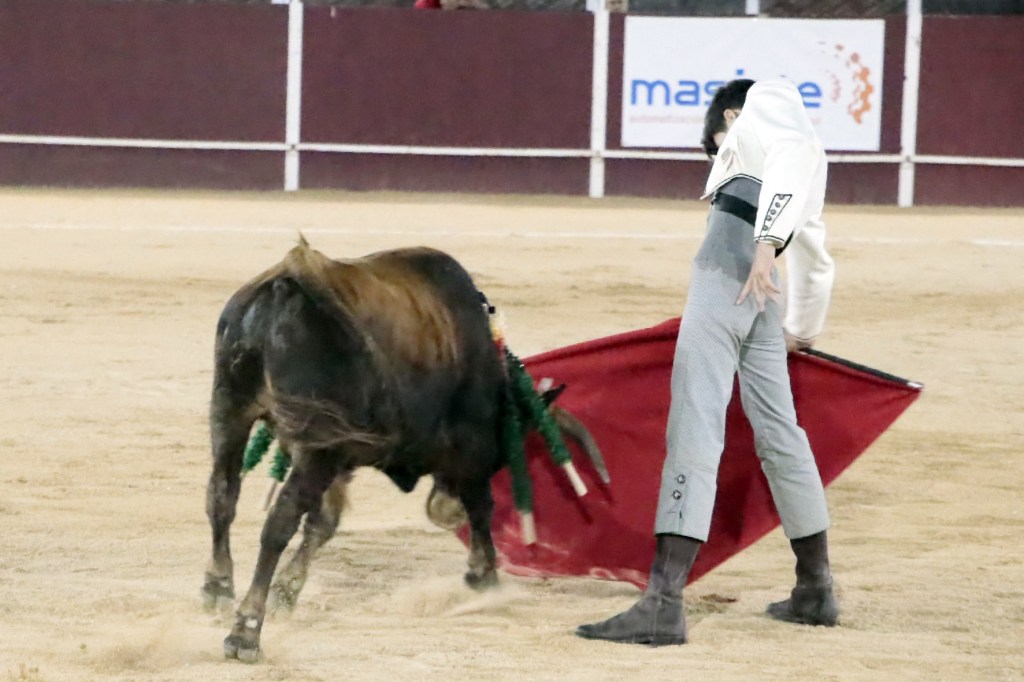 Toni Marín recibió arrebatado por delantales a su becerro, resultando los mismos algo enganchados, pasando después a dejar chicuelinas con mucho mando y transmisión al tendido. El murciano, alumno de la escuela «Amigos del Toreo», inició la faena de hinojos, dejando un derechazo afarolado que gustó mucho al respetable. Estuvo solvente y capaz por ambos pitones, ante un animal con más transmisión y poder que el primero de la tarde. Faena vistosa y muy entregada en la que consiguió, pese a los nervios, muletazos con mando. Estuvo valiente Marín, ajustándose de verdad en una serie de manoletinas. Dejó una estocada trasera y desprendida. El puntillero le levantó al toro, pero eso no fue un obstáculo para que el público le pidiese las dos orejas que la presidencia concedió sin discusión.