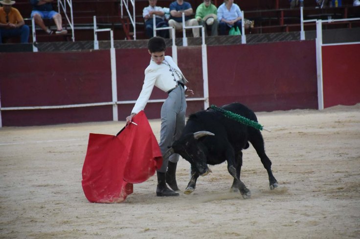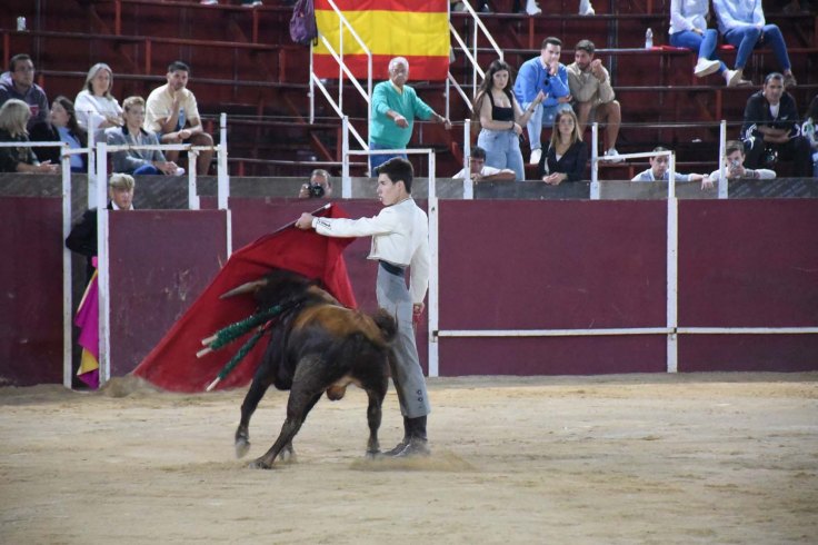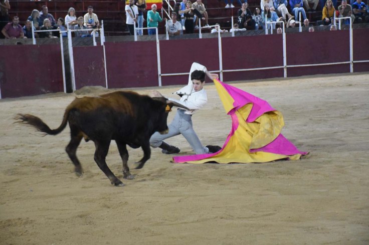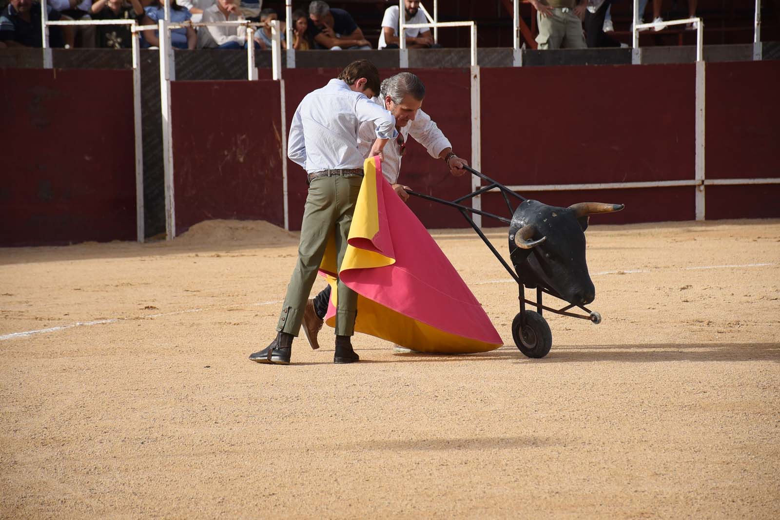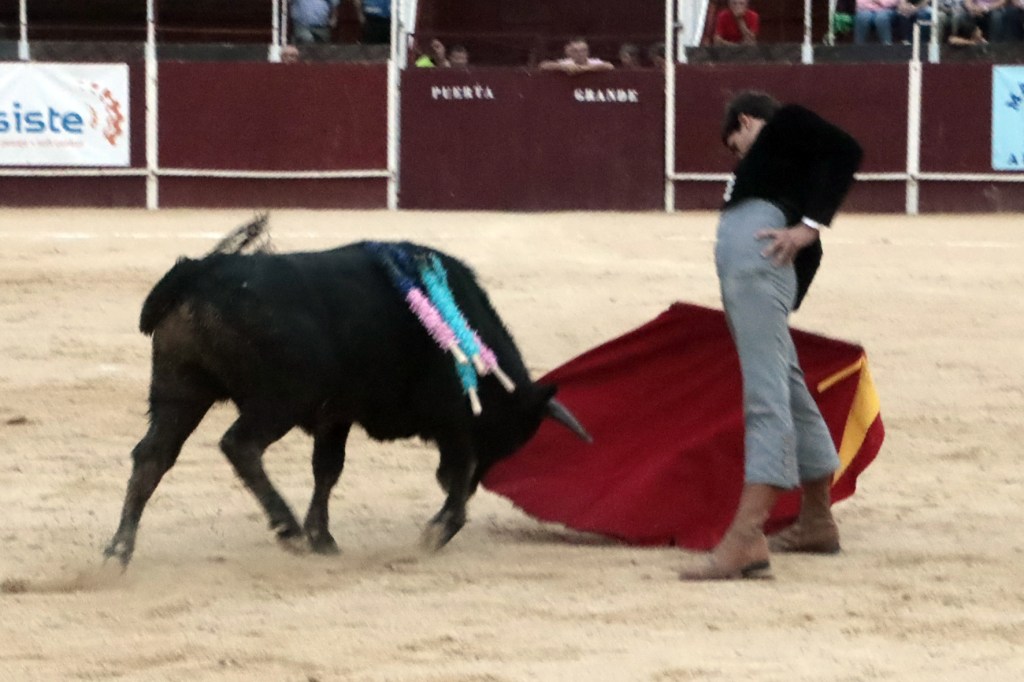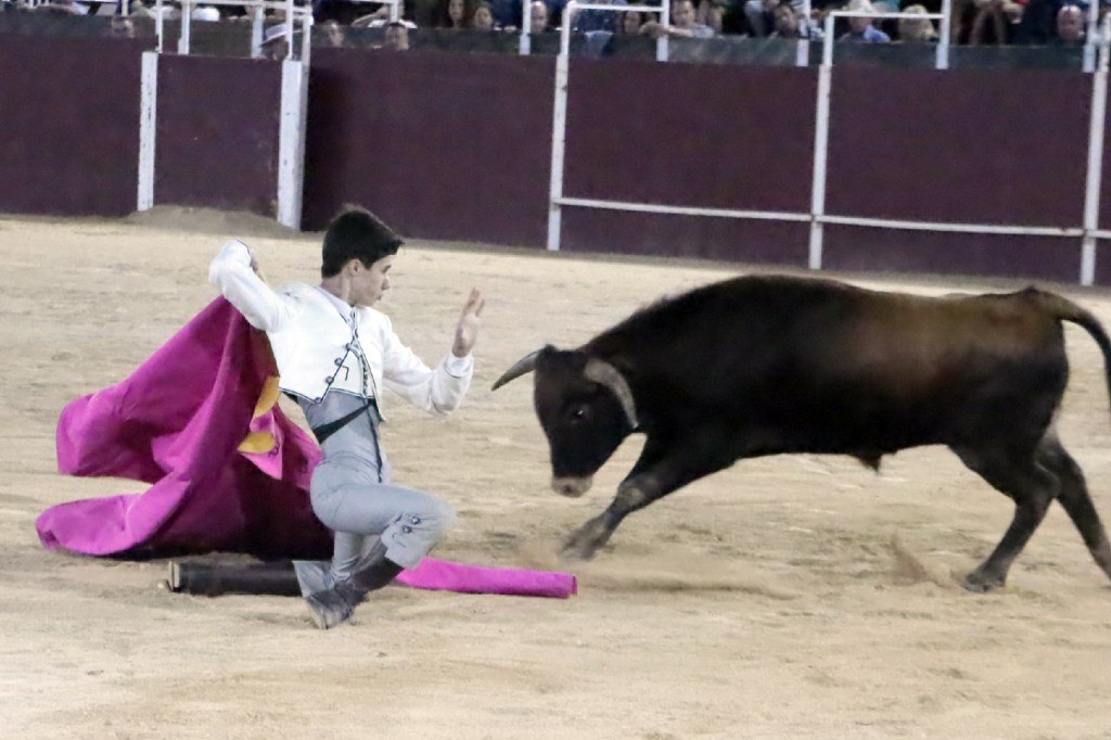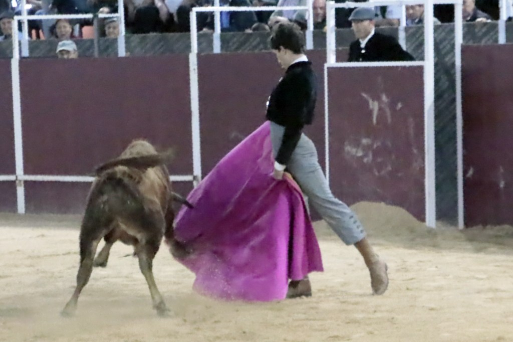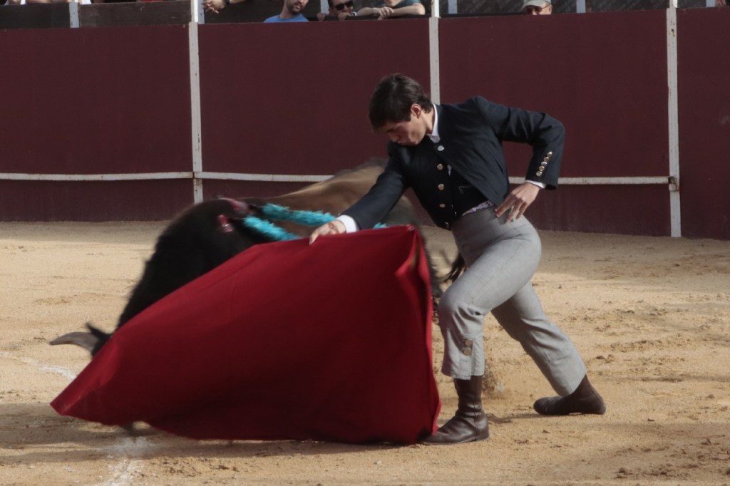 Toni Marín recibió arrebatado por delantales a su becerro, resultando los mismos algo enganchados, pasando después a dejar chicuelinas con mucho mando y transmisión al tendido. El murciano, alumno de la escuela «Amigos del Toreo», inició la faena de hinojos, dejando un derechazo afarolado que gustó mucho al respetable. Estuvo solvente y capaz por ambos pitones, ante un animal con más transmisión y poder que el primero de la tarde. Faena vistosa y muy entregada en la que consiguió, pese a los nervios, muletazos con mando. Estuvo valiente Marín, ajustándose de verdad en una serie de manoletinas. Dejó una estocada trasera y desprendida. El puntillero le levantó al toro, pero eso no fue un obstáculo para que el público le pidiese las dos orejas que la presidencia concedió sin discusión.