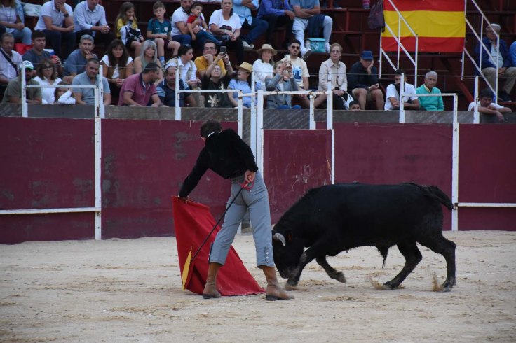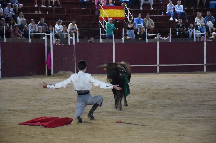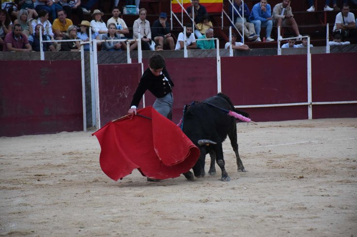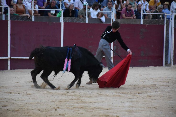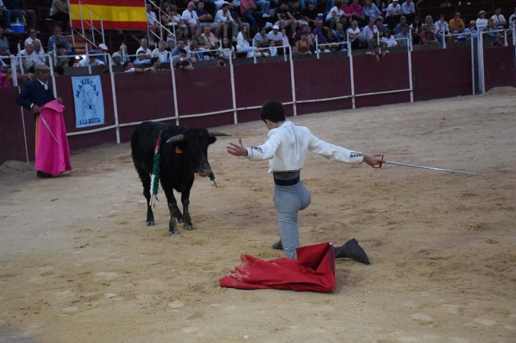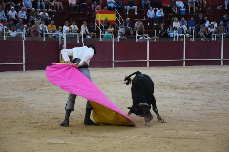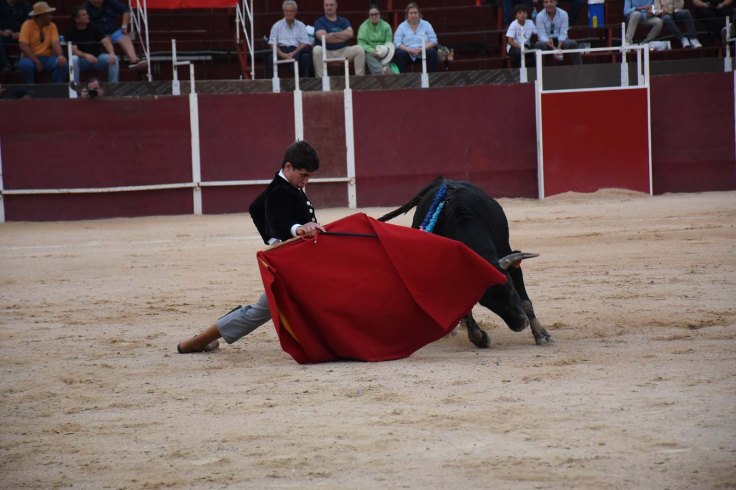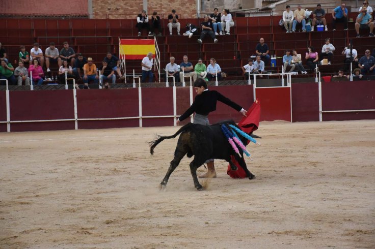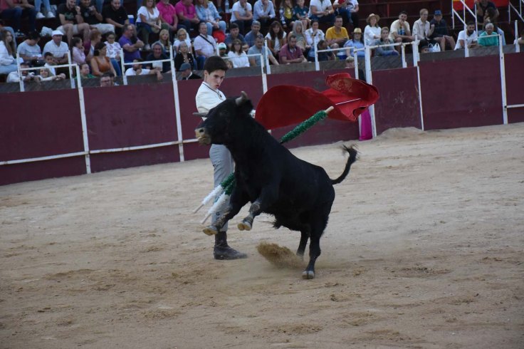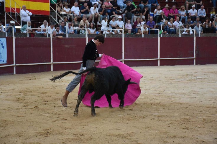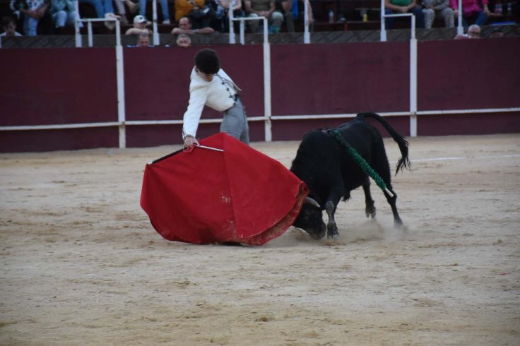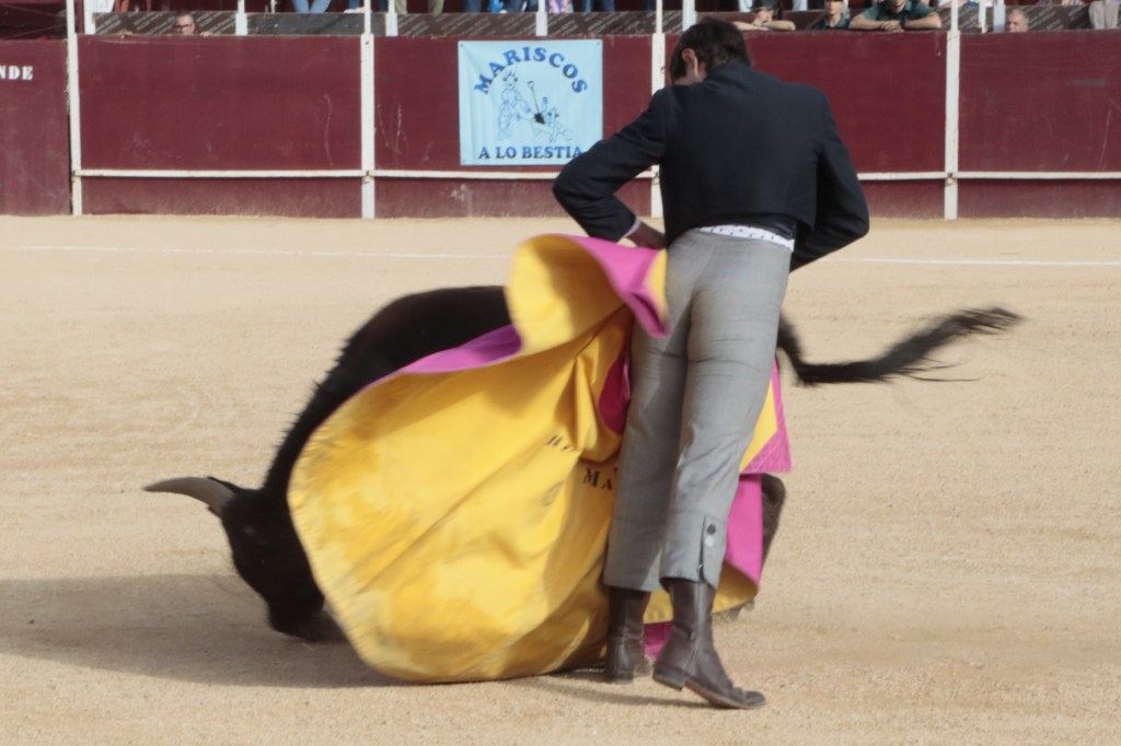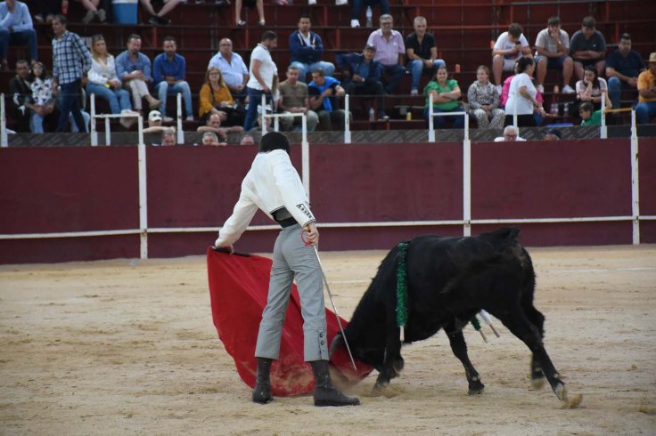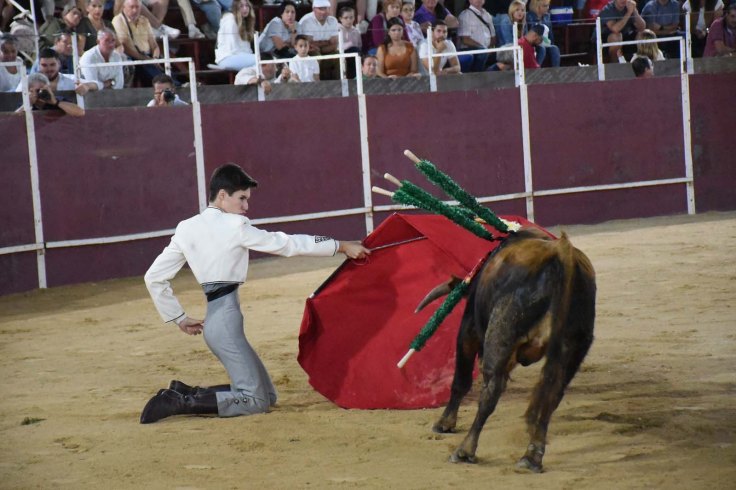Toni Marín recibió arrebatado por delantales a su becerro, resultando los mismos algo enganchados, pasando después a dejar chicuelinas con mucho mando y transmisión al tendido. El murciano, alumno de la escuela «Amigos del Toreo», inició la faena de hinojos, dejando un derechazo afarolado que gustó mucho al respetable. Estuvo solvente y capaz por ambos pitones, ante un animal con más transmisión y poder que el primero de la tarde. Faena vistosa y muy entregada en la que consiguió, pese a los nervios, muletazos con mando. Estuvo valiente Marín, ajustándose de verdad en una serie de manoletinas. Dejó una estocada trasera y desprendida. El puntillero le levantó al toro, pero eso no fue un obstáculo para que el público le pidiese las dos orejas que la presidencia concedió sin discusión.