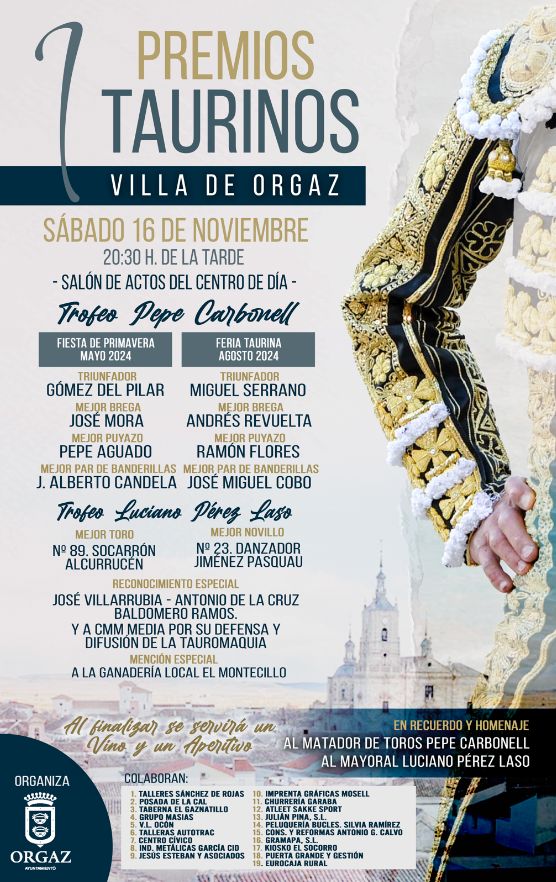 El Ayuntamiento de Orgaz entregará el próximo sábado, 16 de noviembre, los premios Taurinos «Villa de Orgaz», en homenaje al matador de toros Pepe Carbonell y al mayoral Luciano Pérez Laso, figuras emblemáticas del mundo del toro de esta población toledana.