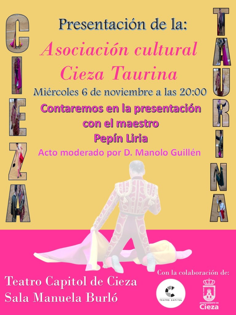 Este miércoles, 6 de noviembre, a las 20 horas, se presenta la asociación cultural «Cieza Taurina». El acto público de presentación tendrá lugar en el Teatro Capitol de la ciudad. El crítico taurino Manolo Guillén moderará la velada, estando apadrinada por Pepín Liria.
