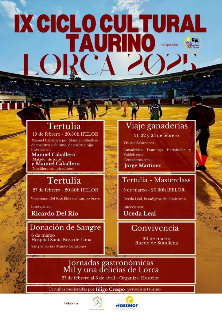El próximo miércoles 19 de febrero, a las 20:30 horas, en el salón de actos del Palacio de Ferias y Congresos de Lorca (IFELOR), arrancará el Ciclo con la tertulia protagonizada por el torero albaceteño Manuel Caballero y su hijo, también del mismo nombre, Manuel Caballero, uno de los novilleros con picadores más destacados de la actualidad. Ambos conversarán sobre sus carreras y de la relación que mantienen como padre e hijo y como maestro y alumno de la difícil tarea de querer ser torero. La tertulias, como todas las de la programación, estará moderada por Iñigo Crespo.