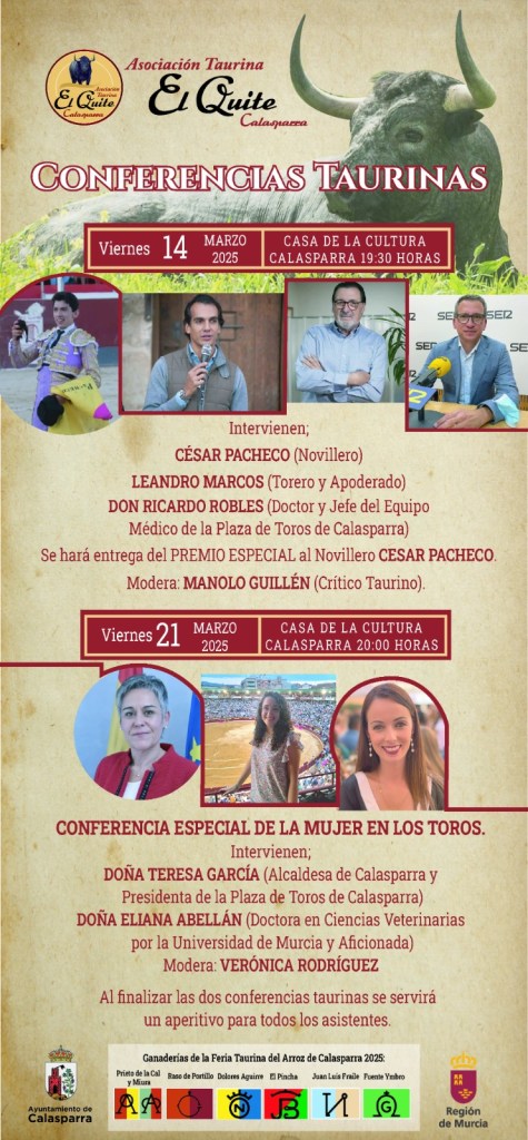 El Viernes 21 de marzo la conferencia girará en torno al papel de la mujer en el mundo del toro. En ella participarán Teresa García, alcaldesa de Calasparra y presidenta de los festejos taurinos en la Villa del Arroz; y Eliana Abellán, doctora en Ciencias Veterinarias, abogada y aficionada. El acto será moderado por Verónica Rodríguez.