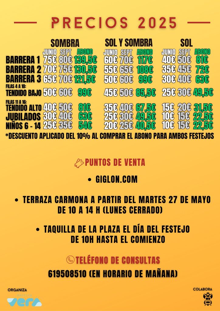 Las entradas para los festejos, van desde los 80 euros de la más cara hasta los 10 de la más asequible. Las mismas se podrán adquirir en forma de abono y de manera individual a través de la web www.giglon.com, y podrán adquirirse presencialmente en Restaurante Terraza Carmona de Vera a partir del día 27 de mayo de 10:00 a 14:00, y el día del festejo en horario ininterrumpido a partir de las 10:00 de la mañana en las taquillas de la plaza de toros.