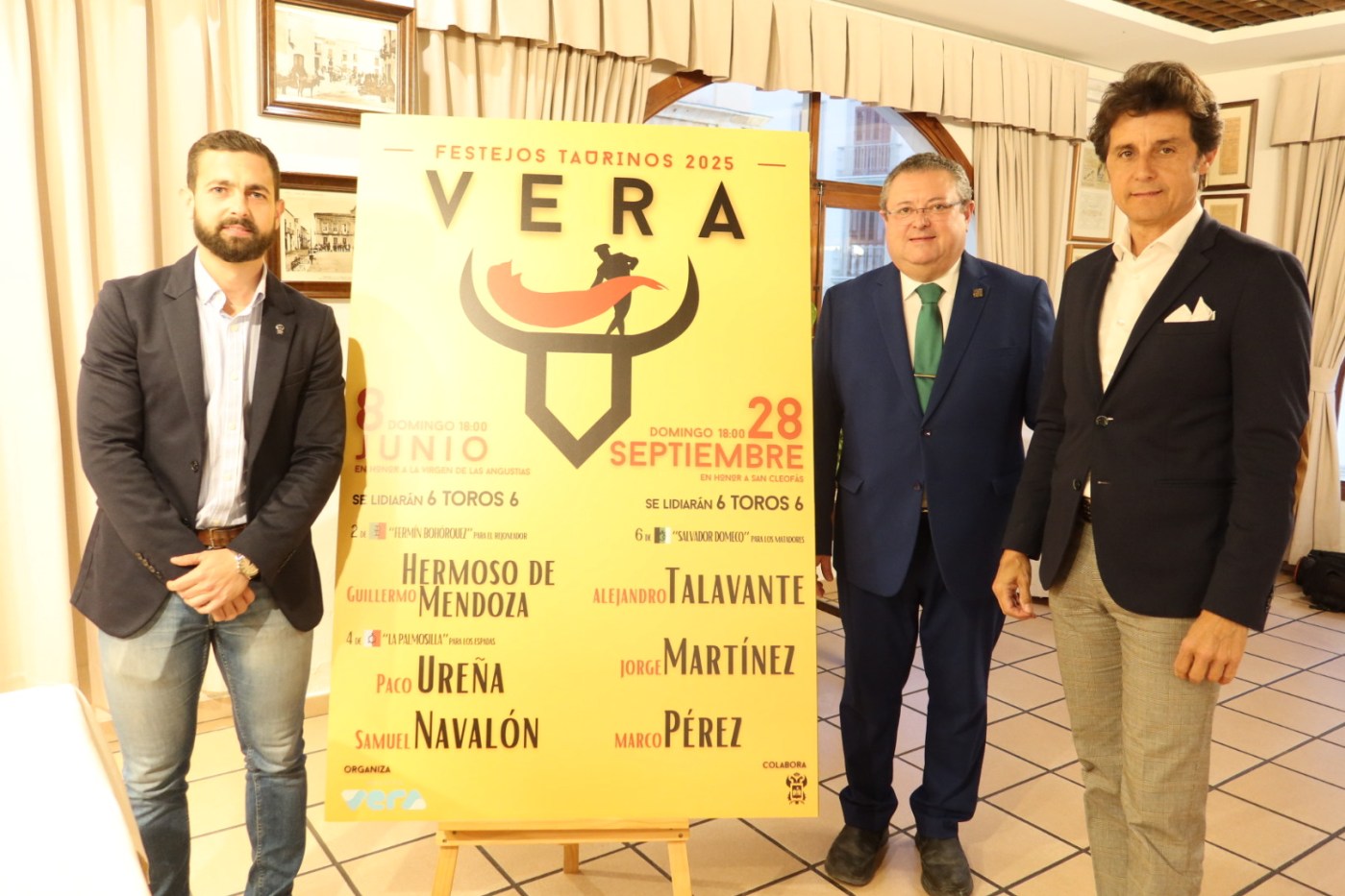 El ayuntamiento de Vera ha anunciado en el Hotel-Restaurante Terraza Carmona el cartel de las corridas de toros organizadas para los próximos meses de junio y septiembre en el marco de celebración de las fiestas en honor a sus patrones, Ntra. Sra. la Santísima Virgen de las Angustias y San Cleofás. Dicho acto, al que asistieron numerosos aficionados, contó con las intervenciones de Ginés Carmona, anfitrión; Manuel Ruiz, asesor; y Antonio Soler, concejal de cultura.