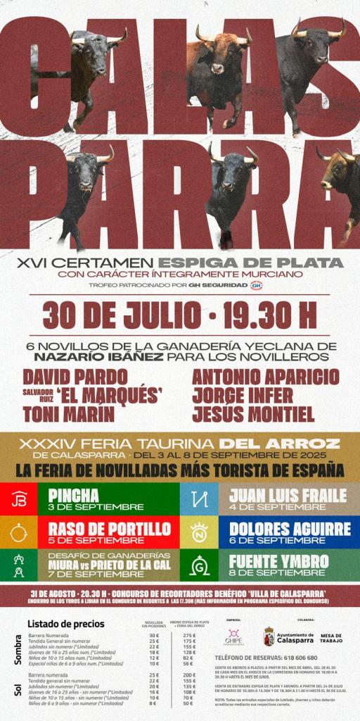 El año taurino en la Villa del Arroz se abrirá en la tradicional fecha de los Santos patrones, Abdón y Senén, el 30 de julio, a las 19:30 horas. El prestigioso certamen para novilleros sin caballos, trofeo “Espiga de Plata”, patrocinado por GH Seguridad, se lo disputarán 6 murcianos ante novillos de la ganadería, también murciana, de Nazario Ibáñez. David Pardo, Salvador Ruiz “El Marqués”, Toni Marín, Antonio Aparicio, Jorge Infer y Jesús Montiel, demostrarán en el ruedo el estado de la cantera inagotable de toreros murcianos.