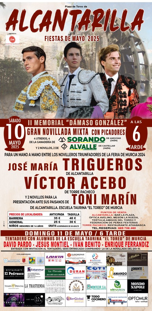 Con el único motivo de repetir el éxito del pasado año, en cuanto a la asistencia de público se refiere; la empresa Eventos Tauromur (organizadora de la novillada con picadores mixta que tendrá lugar el próximo 10 de mayo en Alcantarilla en la que actuarán los novilleros con picadores murcianos José María Trigueros y Víctor Acebo, y el novillero sin picadores Toni Marín, frente a reses de Sorando y Alvalle) ha puesto a la venta las entradas para el festejo.