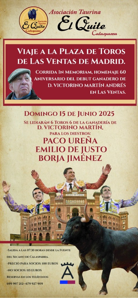 La Asociación Taurina “El Quite de Calasparra” continúa con sus actividades y en esta ocasión ha organizado un viaje a la Plaza de Toros de Las Ventas de Madrid para el próximo domingo 15 de junio, con el objetivo de presenciar la corrida de toros de D. VICTORINO MARTÍN, corrida in memoriam en homenaje por el 60 aniversario del debut ganadero de D. VICTORINO MARTÍN ANDRÉS en Las Ventas de Madrid. El murciano de Lorca PACO UREÑA abrirá el cartel, que completarán nada menos que EMILIO DE JUSTO y BORJA JIMÉNEZ. Es sin duda, uno de los carteles más atractivos del serial y de la temporada.