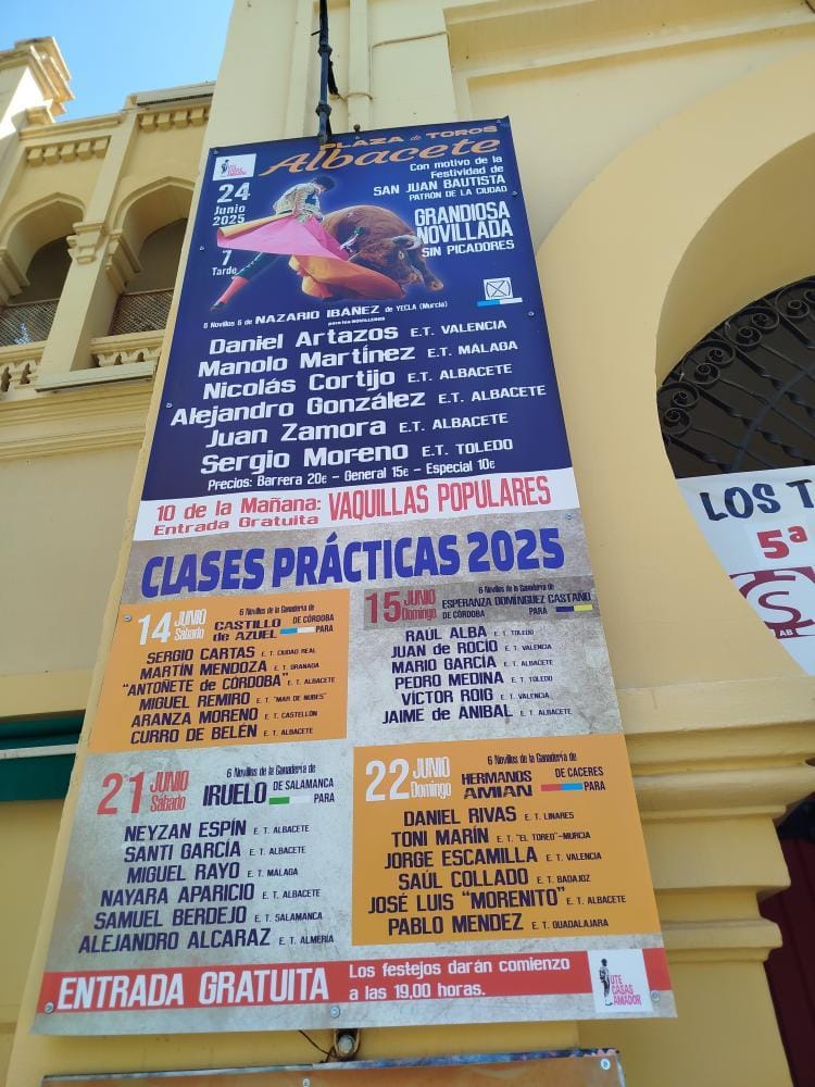 La empresa UTE Casas-Amador hace oficial los carteles de la novillada sin picadores y cuatro clases prácticas que se celebrarán en la plaza de toros de Albacete con motivo de la festividad de San Juan, patrón de la ciudad manchega. Estos festejos se celebrarán del 14 al 24 de junio.