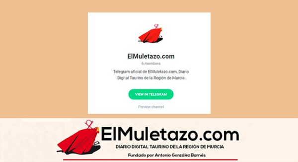 ElMuletazo.com refuerza su servicio informativo con un nuevo canal de comunicación con sus lectores a través Telegram, una aplicación de mensajería instantánea con la que los usuarios recibirán las noticias más destacadas de la actualidad taurina de la Región de Murcia. Los lectores interesados en recibir las novedades informativas en su teléfono móvil pueden inscribirse... Leer más →