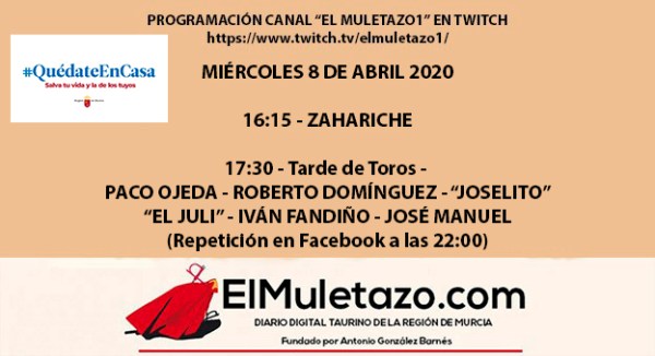 PROGRAMACIÓN CANAL «EL MULETAZO» MIÉRCOLES 8 DE ABRIL – EN EMISIÓN DESDE LAS 16:15 #QuédateEnCasa