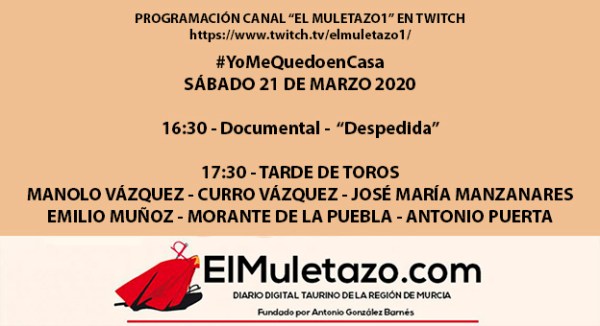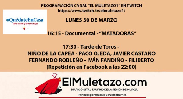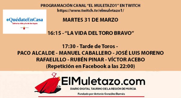 PROGRAMACIÓN CANAL «EL MULETAZO» MARTES 24 DE MARZO – ONLINE DESDE LAS 16:30h