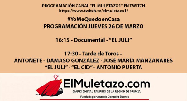 PROGRAMACIÓN CANAL «EL MULETAZO» JUEVES 26 DE MARZO – ONLINE DESDE LAS 16:15 #Quedateencasa