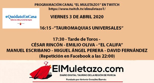 Para la tarde de este Viernes 3 de abril en el canal “ElMuletazo1” de Twitch les tenemos preparada la siguiente programación: A las 16:15 podremos ver el documental “Tauromaquias Universales” Desde las 17:30 horas les ofreceremos otro festejo de la feria de #Yomequedoencasa. Hoy domingo con faenas de: CÉSAR RINCÓN EMILIO OLIVA “EL CALIFA” MANUEL... Leer más →