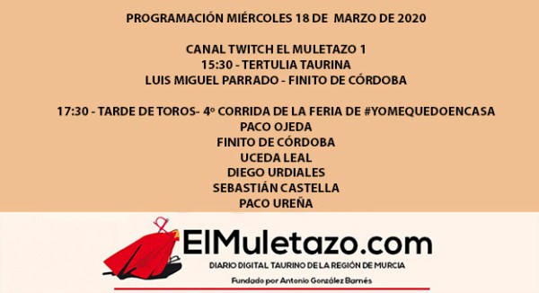 PROGRAMACIÓN CANAL EL MULETAZO PARA ESTE 18 DE MARZO, EN DIRECTO DESDE LAS 15:30