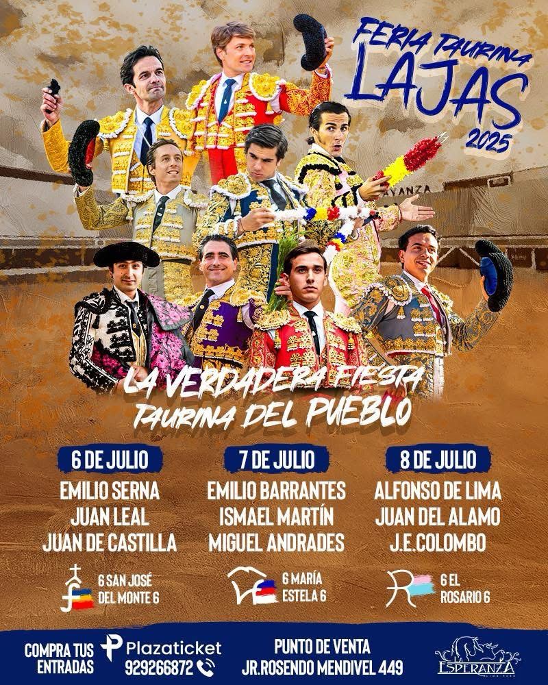 Mientras en la tierra que le vio nacer siguen sin contar con él, en la jornada de este viernes hemos conocido oficialmente las combinaciones de la feria taurina de la ciudad peruana de Lajas, en la que actuará el murciano Emilio Serna, en un cartel junto a Juan Leal y Juan de Castilla ante toros de “San José del Monte” el 6 de julio.