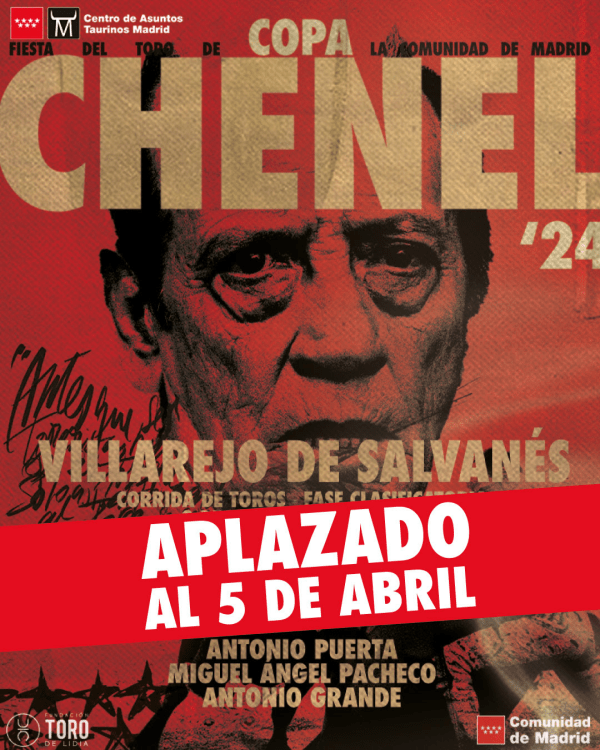A causa de la previsión de fuertes y persistentes lluvias en los próximos días, el festejo de la Copa Chenel del sábado 30 de marzo en Villarejo de Salvanés queda aplazado al viernes 5 de abril a las 18:00 horas. Este sábado tendría lugar el sexto festejo clasificatorio de la Copa Chenel en Villarejo de Salvanés... Leer más →